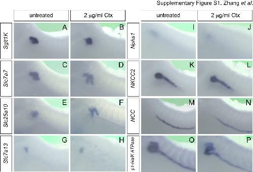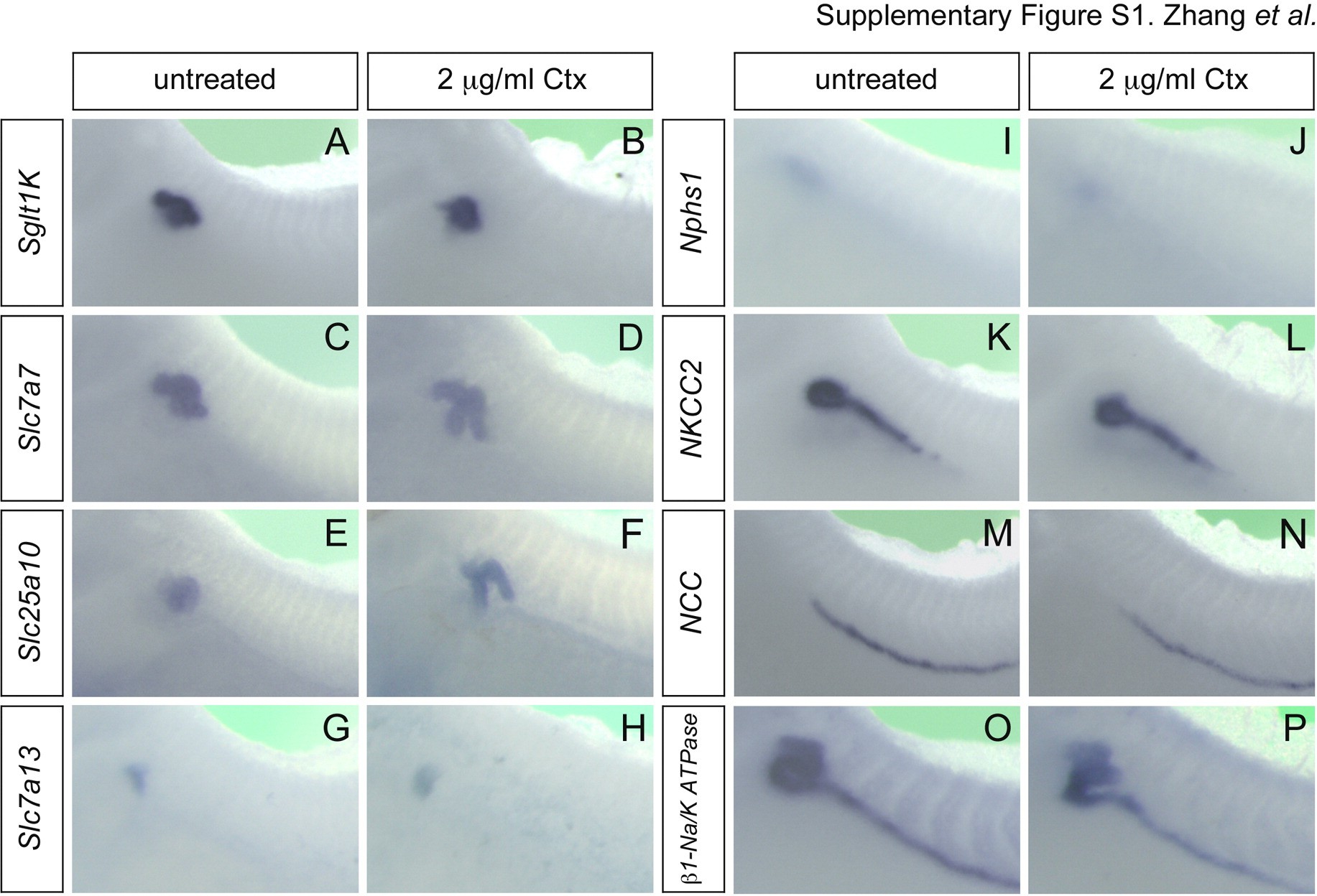 Supplementary Fig. S1. Segment-specific pronephric marker genes are not affected by cholera toxin. (A�P) Whole mount in situ hybridization of control and Ctx-treated Xenopus embryos at stage 39 with Sglt1K (A and B), Slc7a7 (C and D), Slc25a10 (E and F), Slc7a13 (G and H), Nphs1 (I and J), Nkcc2 (K and L), Ncc (M and N) and β1-Na/K-ATPase (O and P).