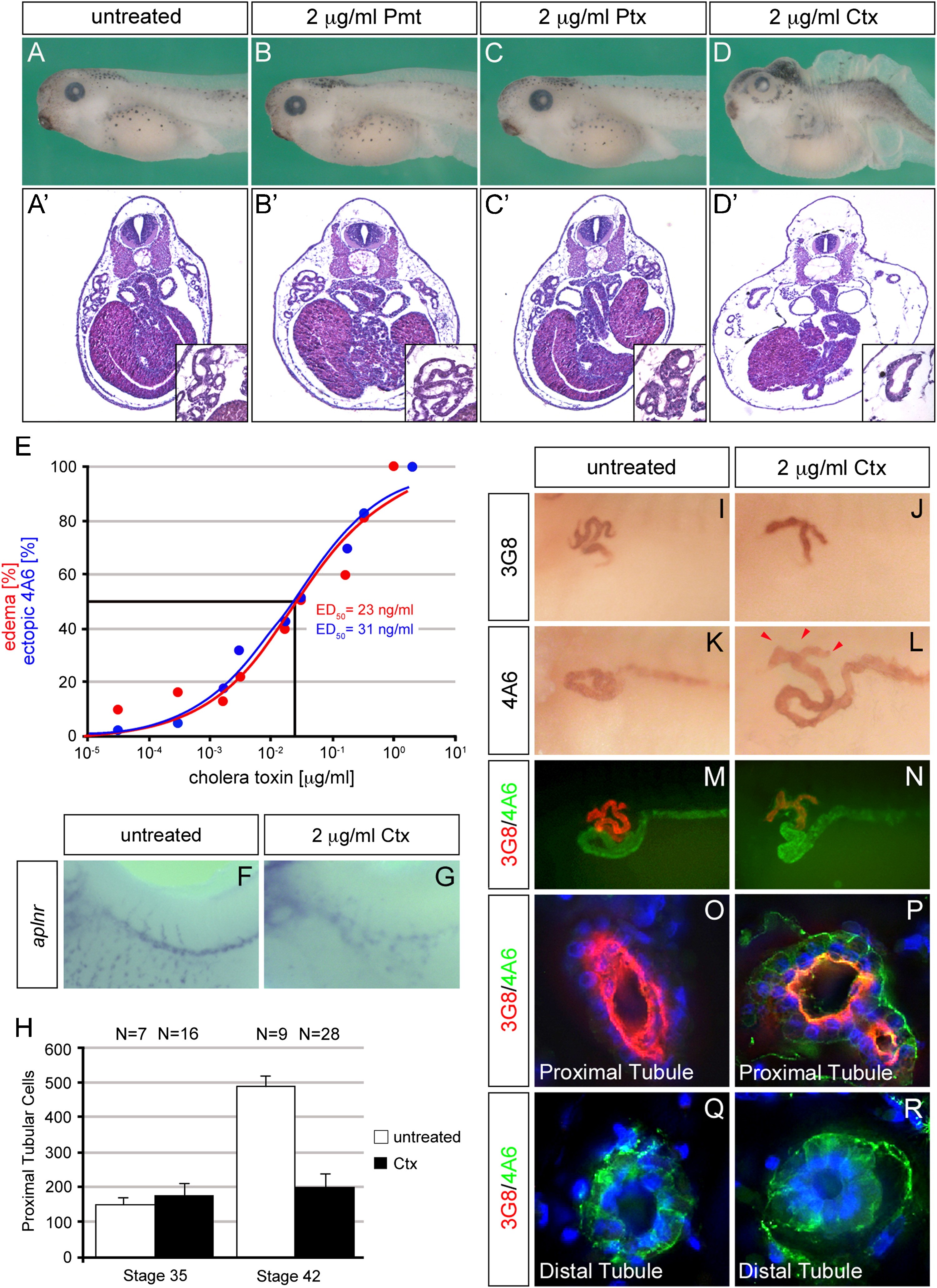 In the kidney, proximal tubules are very important for the reabsorption of water, ions and organic solutes from the primary urine. They are composed of highly specialized epithelial cells that are characterized by an elaborate apical brush border to increase transport efficiency. Using the pronephric kidney of Xenopus laevis we discovered that the G-protein modulator cholera toxin resulted in a dramatic reduction of the proximal tubular size. This phenotype was accompanied by changes in the cytoarchitecture characterized by ectopic expression of the distal tubular marker 4A6 and an impairment of yolk platelet degradation. In addition, cholera toxin caused edema formation. However, this phenotype was not due to kidney defects, but rather due to impaired vasculature development. Based on experiments with antisense morpholino oligomers as well as pharmacological agonists and antagonists, we could show that the complex phenotype of cholera toxin in the pronephric kidney was caused by the hyperactivation of a single G-protein alpha subunit, Gnas. This-in turn-caused elevated cAMP levels, triggered a Rapgef4-dependent signaling cassette and perturbed exo- and endocytosis. This perturbation of the secretory pathway by Ctx was not only observed in Xenopus embryos. Also, in a human proximal tubular cell line, cholera toxin or a Rapgef4-specific agonist increased uptake and decreased secretion of FITC-labeled Albumin. Based on these data we propose that the Gnas/cAMP/Rapgef4 pathway regulates the signals inducing the proliferation of proximal tubules to acquire their final organ size.