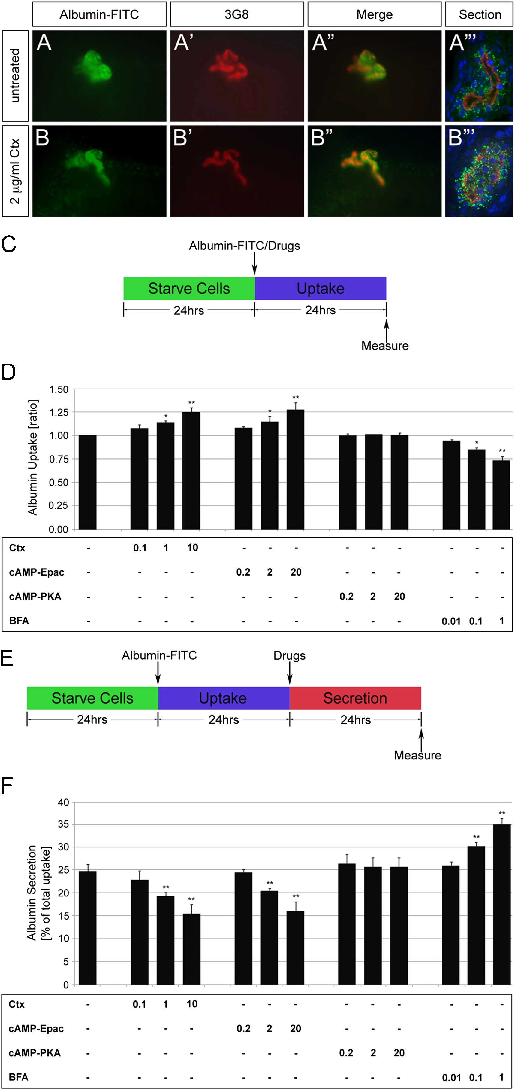 Fig. 5. Cholera toxin regulates albumin uptake and secretion. (A-B‴) Untreated or Ctx-treated Xenopus embryos were injected with Albumin-FITC (green) at stage 35. Embryos were fixed after 3 h, stained with 3G8 (red) and examined in whole mounts (A and A″, B and B″) and sections thereof (A‴ and B‴). DAPI was used to counterstain nuclei (blue). (C) Schematic for the uptake assay in HK-2 cells. (D) Bar diagram of Albumin-FITC uptake of HK-2 cells treated with different doses of Ctx, cAMP-Epac, cAMP-PKA and BFA. (E) Schematic for the secretion assay in HK-2 cells. (F) Bar diagram of Albumin-FITC secretion of HK-2 cells treated with different doses of Ctx, cAMP-Epac, cAMP-PKA and BFA. Data were analyzed by Student's t-test with indicating a p value of <0.05 and a p value of <0.01.