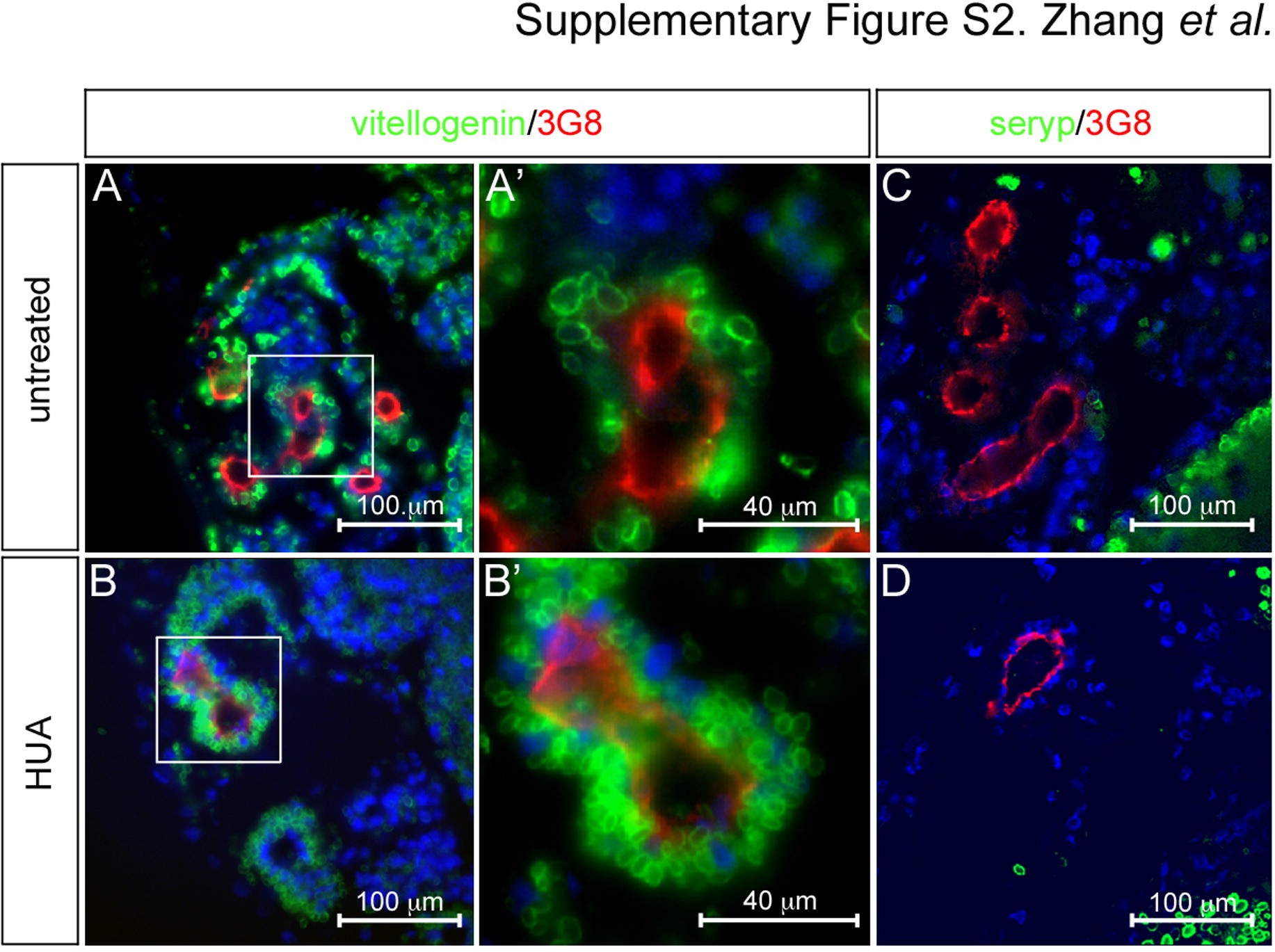 Supplementary Fig. S2. Inhibiting of proliferation causes yolk platelet accumulation. (A�D) Immunofluorescence staining of proximal tubules using 3G8 (red), anti-vitellogenin or anti-seryp antibodies (green) comparing untreated and Hydroxyurea/Aphidicolin (HUA) treated embryos at stage 40. (A′ and B′) are close-ups of the proximal tubules indicated by white boxes in (A and B); nuclei were counterstained with DAPI (blue).