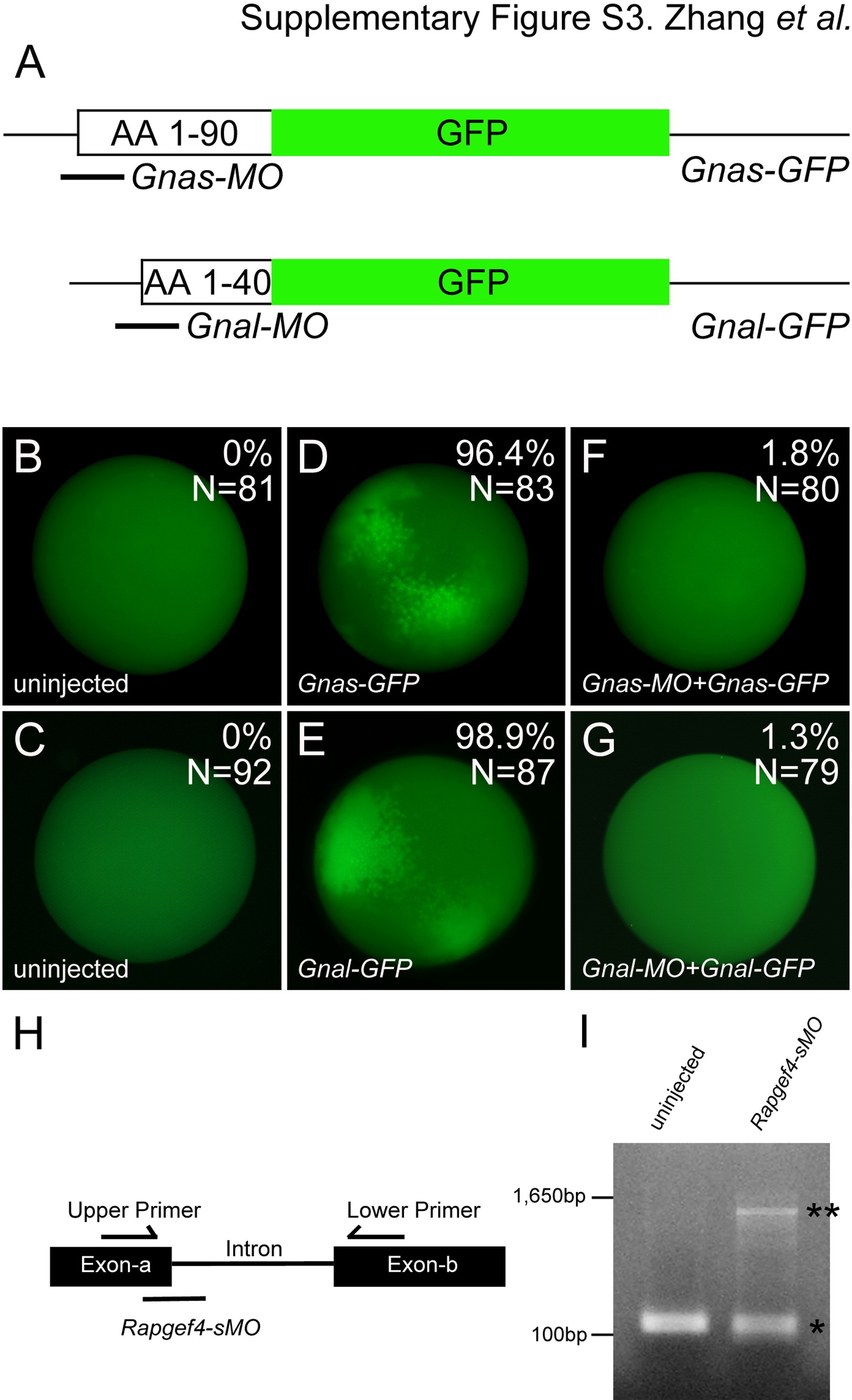 Supplementary Fig. S3. Efficacy of the antisense morpholino oligomers. (A) Schematic of the GFP fusion proteins containing the 5′UTR and part of the coding sequence of Gnas and Gnal. The position of the Gnas-MO and Gnal-MO are indicated. (B�G) Xenopus embryos were injected animally with the Gnas-MO and Gnal-MO at the 2�4 cells stage followed by two diametral injections of synthetic mRNA encoding either Gnas- or Gnal-GFP at the 8-cell stage, while control embryos were only injected with the Gnas- or Gnal-GFP mRNA. Embryos were analyzed at stage 10.5 by florescence microscopy. Representative images are shown and the percentage of GFP-positive embryos is indicated in the upper right corner of each panel. (H) Schematic of the exonic sequence targeted by Rapgef4-sMO. Positions of the PCR primers used to test the splicing efficacy are indicated. (I) Representative image of the PCR reaction using mRNA from embryos injected with Rapgef4-sMO or uninjected controls. Position of the correctly spliced and the unspliced mRNA are indicated by one or two asterisks, respectively.