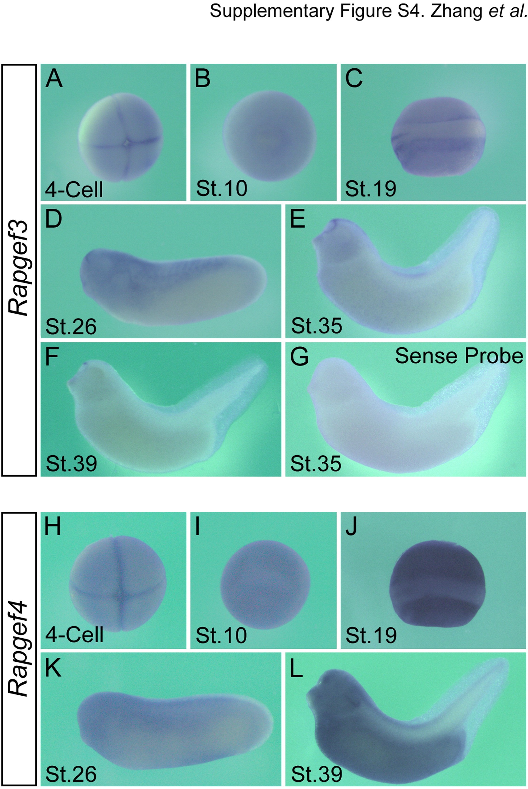Supplementary Fig. S4. Expression of Rapgef3 and Rapgef4. (A�L) whole mount in situ hybridization of Xenopus embryos at different developmental stages with an antisense probe for Rapgef3 (A�F), its corresponding sense control (G) and an antisense probe for Rapgef4 (H�L).