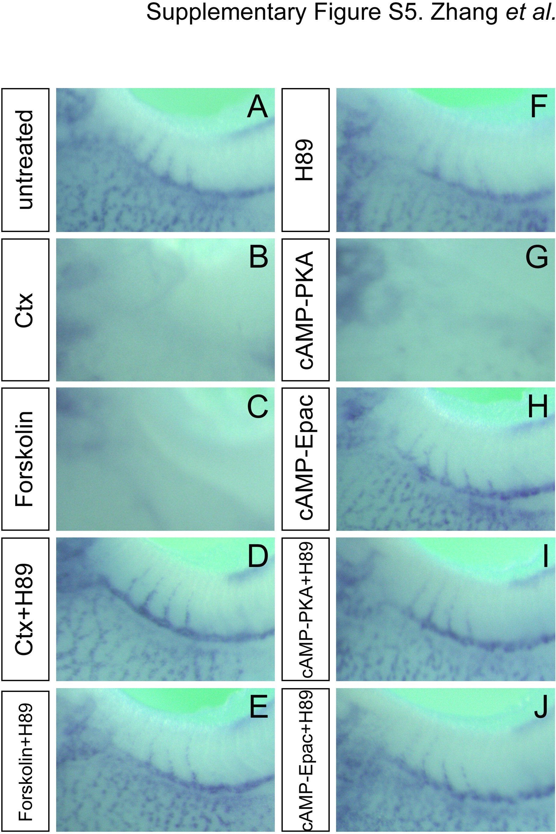 Supplementary Fig. S5. Expression of aplnr upon modulating cAMP Signaling. (A�J) Whole mount in situ hybridization for aplnr comparing untreated controls and embryos treated with several drugs modulating cAMP signaling.