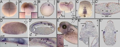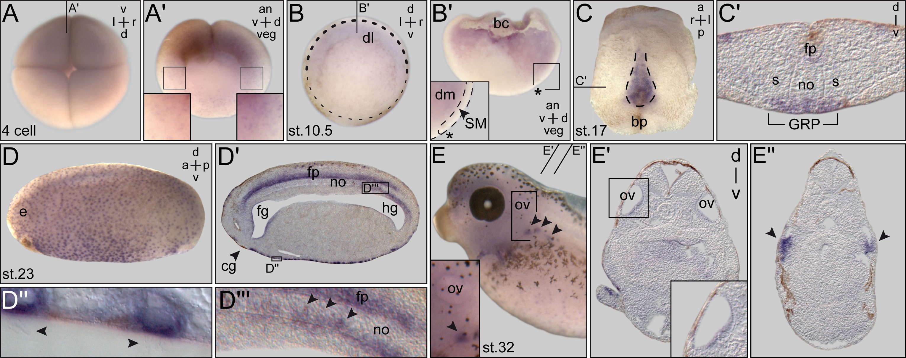 Figure 1. PACRG expression during early Xenopus development. (A) Expression at the four-cell stage (top view). (Aâ) Sagittal hemisection of embryo shown in (A). Enlargements (boxes) indicate higher expression levels on the dorsal side. (B) Gastrula embryo. Persistent differences in staining intensities between dorsal and ventral side. (Bâ) Sagittal hemisection (plane indicated in (B)) revealing mRNA localization in deep mesoderm. Note that the superficial mesoderm (SM) was free of PACRG mRNA (inset in (Bâ)). Dorsal lip marked by asterisk. (C) Expression in the gastrocoel roof plate (GRP) at stage 17 (dorsal explant shown in ventral view). (Câ) Histological section (plane marked in (C)). (D) Expression at stage 23 in ciliated cells of the epidermis and the floor plate (sagittal section shown in (Dâ)). Enlargements show multiciliated skin cells ((Dâ); cilia indicated by arrowheads) and GRP cells after intercalation into the notochord ((Dââ); arrowheads). (E) Staining in the otic vesicle and nephrostomes (arrowheads). (Eâ,Eâ) Histological sections (levels indicated in (E)) highlighting expression in the otic vesicle (Eâ) and nephrostomes ((Eâ), arrowheads). aâ=âanterior; anâ=âanimal; bcâ=âblastocoel; bpâ=âblastopore; dâ=âdorsal; dlâ=âdorsal lip; dmâ=âdeep mesoderm; fgâ=âforegut; fpâ=âfloor plate; hgâ=âhindgut; lâ=âleft; noâ=ânotochord; ovâ=âotic vesicle; pâ=âposterior; râ=âright; sâ=âsomite; vâ=âventral; vegâ=âvegetal. |