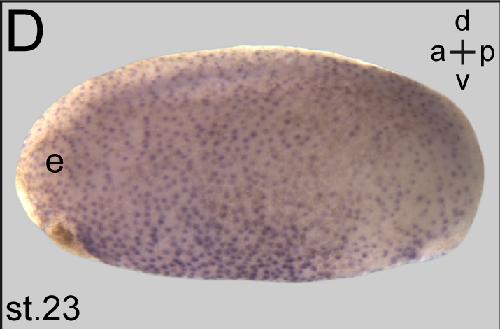 pacrg (PARK2 co-regulated) gene expression in Xenopus laevis embryo, assayed via in situ hybridization, NF stage 23, lateral view, anterior left, dorsal up. |