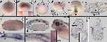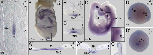 Figure 3. PACRG expression during early rabbit, mouse and zebrafish development. Whole-mount in situ hybridization of staged embryos. (A) Rabbit. Three somite (3S) stage blastodisc revealing PACRG expression in the posterior notochord (PNC) and floor plate. (Aâ) Sagittal section. (Aâ) Transversal section (level marked in (A)). Note that the sagittal section revealed absence of PACRG from the node (Aâ). (B,C) Mouse. (B) E7.5 late headfold mouse embryo displaying PACRG expression in the PNC and floor plate. (Bâ) Sagittal section. (Bâ) Transversal histological section. (C) E9.5 embryo. Otic vesicle shown in higher magnification in inset. Box indicates brain region of which a histological section is provided in (Câ). (Câ) Histological sagittal section, revealing staining in ventral midline of the brain. (D) 6-Somite stage zebrafish embryo. PACRG expression in the Kupfferâs vesicle (KV) and floor plate. aâ=âanterior; dâ=âdorsal; eâ=âeye; fpâ=âfloor plate; hâ=âheart; lâ=âleft; nâ=ânode; noâ=ânotochord; ovâ=âotic vesicle; pâ=âposterior; râ=âright; sâ=âsomite; tbâ=âtail bud; vâ=âventral. |