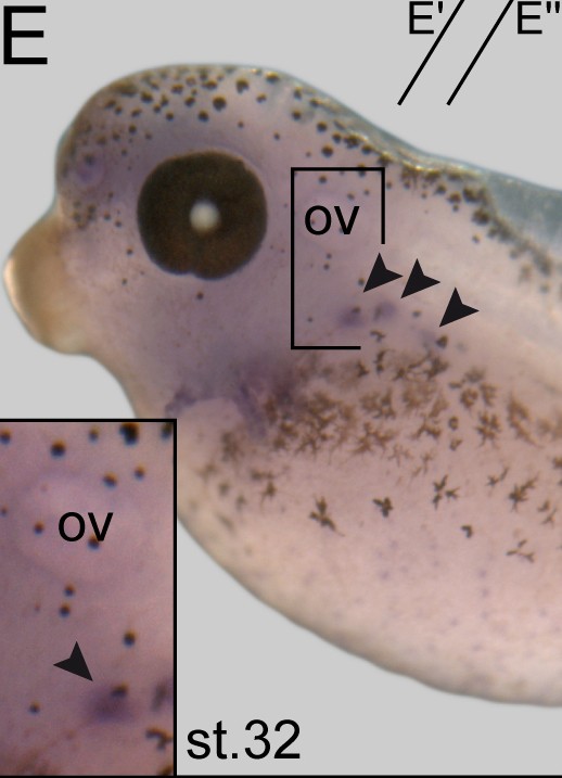 pacrg (PARK2 co-regulated) gene expression in Xenopus laevis embryo, assayed via in situ hybridization, NF stage 32, lateral view, head and trunk region only, anterior left, dorsal up. |