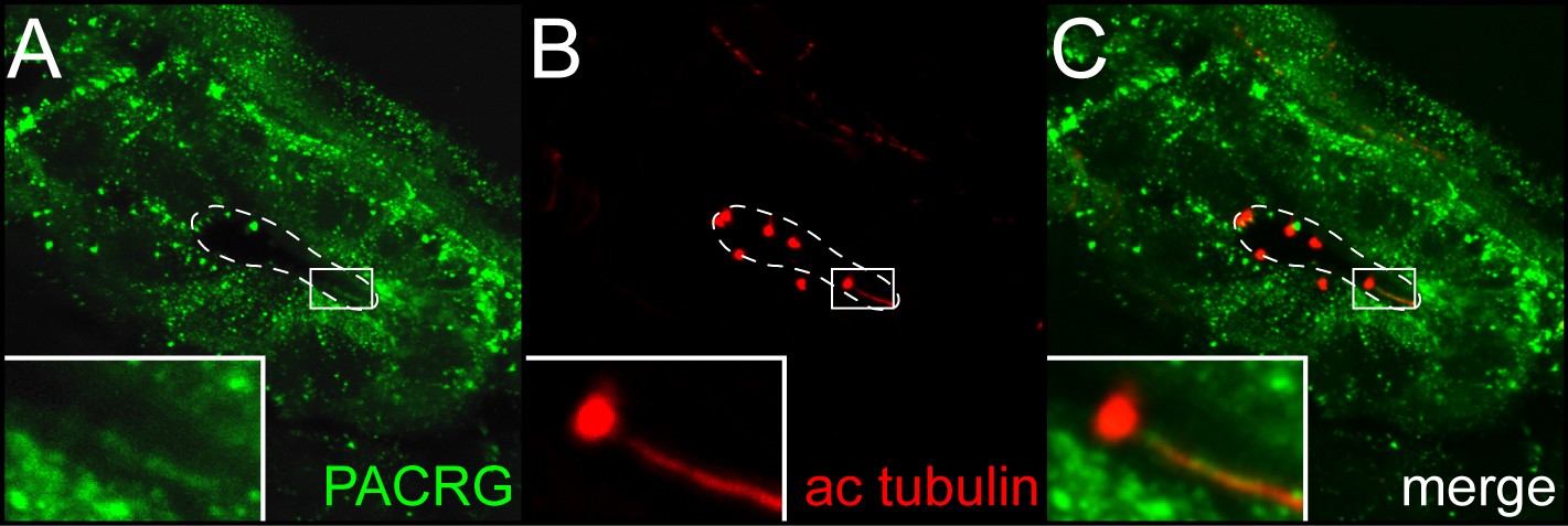 Additional file 2. Additional Figure 2 Localization of PACRG to primary cilia of the pronephric duct. Tadpoles at stage 37/38 were fixed and processed for immunohistochemistry with antibodies specific for PACRG (green) and acetylated tubulin (red). Specimens were sectioned on a vibratome (30μm) and viewed in the confocal laser scanning microscope. The lumen of the pronephric duct is outlined by a white dashed line. White rectangles indicate regions shown in higher magnification in the lower left corner. |