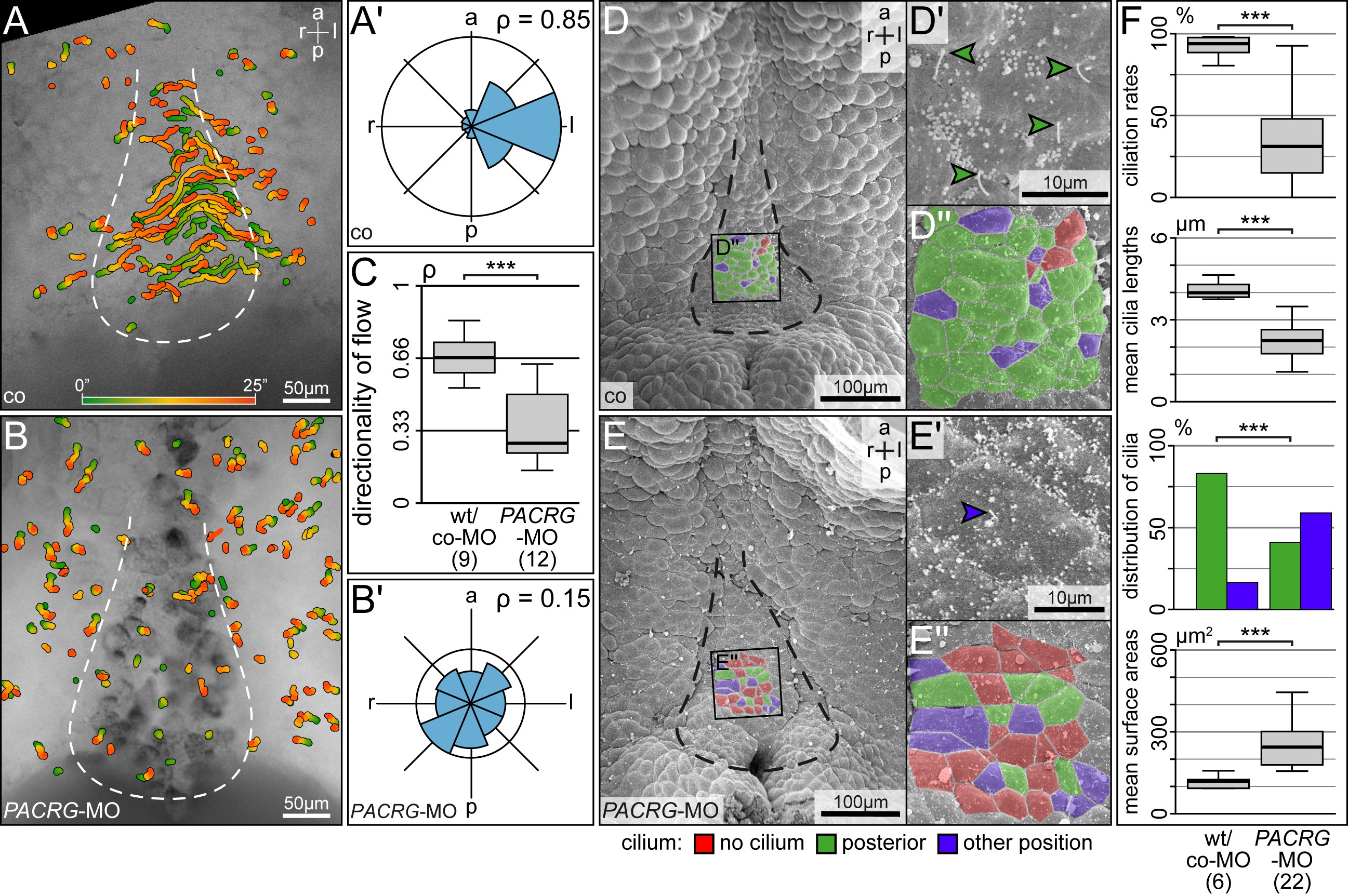 Figure 6. Absence of leftward flow and altered gastrocoel roof plate (GRP) morphology in PACRG morphants. (A,B) Loss of leftward flow in PACRG morphant GRPs. Gradient time trail (GTT) projection of directed bead trajectories (25 s, indicated in color bar). (A',B') Circular histograms of mean angles of trajectories. (C) Quality of flow, as depicted by the dimensionless number rho. (D,E) SEM analysis of wild-type (D) and PACRG morphant (E) dorsal explants. GRP area indicated by dashed line. Note the loss of posterior polarization of cilia in enlargements of characteristic cells in (D',E'), and the marked increase in non-ciliated cells (D'',E''). (F) Altered ciliation rates, mean cilia lengths, polarization of residual cilia and mean apical cell surface areas, as assessed in standardized central GRP areas of 86 μm2 each [21].