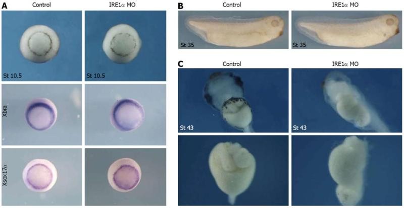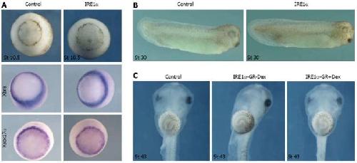 Overexpression of inositol-requiring enzyme 1α affected neither mesoderm and endoderm formation nor gut development. A: Overexpression of inositol-requiring enzyme (IRE) 1α did not change the phenotype and the expression of Xbra and Xsox17α at stage 10.5; B: IRE1α mRNA injected embryos at tailbud stage were nearly normal; C: Embryos injected with IRE1α-GR mRNA did not display any defect until tadpole stage.