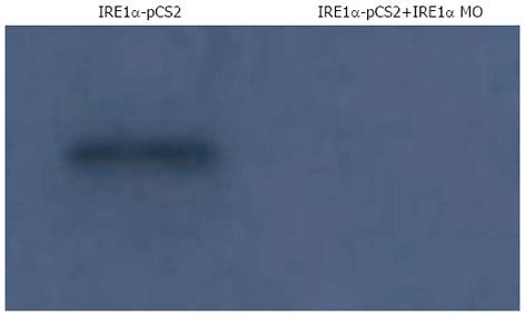Inositol-requiring enzyme 1α morpholino oligonucleotide blocks inositol-requiring enzyme 1α translation in an in vitro transcription/translation assay. In this assay, xIRE1α was effectively transcribed/translated from a pCS2+xIRE1α construct. However, translation was dramatically decreased by addition of IRE1α morpholino oligonucleotide (MO). IRE: Inositol-requiring enzyme.