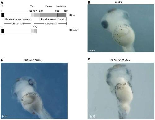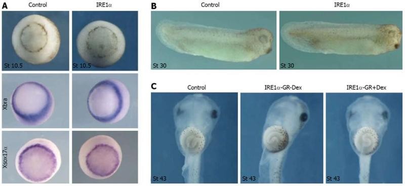 METHODS: Xenopus embryos were obtained with in vitro fertilization and cultured in 0.1 × MBSH. One and half nanogram of IRE1α, 1 ng of IRE1α-GR mRNA, 1 ng of IRE1αΔC-GR mRNA, and 50 ng of IRE1α morpholino oligonucleotide (MO) or XBP1(C)MO were injected into four blastomeres at 4-cell stage for scoring the phenotype and marker gene analysis. To rescue the effect of IRE1α MO, 1 ng of IRE1α-GR mRNA was co-injected with 50 ng of MO. For the activation of the GR-fusion proteins, dexamethasone was prepared as 5 mmol/L stock solutions in 100% ethanol and applied to the mRNA injected embryos at desired stages in a concentration of 10 μmol/L in 0.1 × MBSH. Embryos were kept in dexamethasone up to stage 41. Whole-mount in situ hybridization was used to determine specific gene expression, such as IRE1α, IRE1β, Xbra and Xsox17α. IRE1α protein expression during Xenopus embryogenesis was detected by Western blotting.