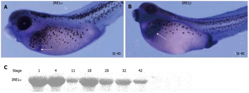 Expression pattern of xIRE1 in Xenopus lavies during development. A, B: Whole-mount in situ hybridizations revealed relatively high expression of inositol-requiring enzyme (IRE) 1α in pancreas (white arrow in A) and relatively high expression of IRE1β in liver (white arrow in B); C: Western blotting revealed temporal expression of IRE1α during Xenopus embryogenesis.