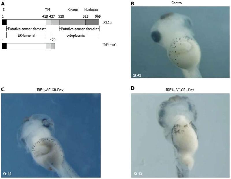 Injection of IRE1αΔC-GR mRNA caused morphological alterations with gut malformation. A: Diagram depicting the construction of deletion mutants. S and TM denote the signal peptide and the transmembrane domain; B-D: Gut defects were also observed with a dominant-negative mutant, IRE1αΔC, lacking the cytoplasmic kinase and RNase domains.