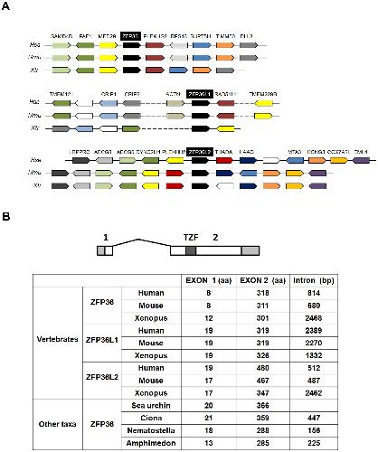 Figure 1. Conservative evolution of vertebrate zfp36 genes. (A) Conserved syntenic regions between human (Hsa), mouse (Mmu) and Xenopus tropicalis (Xtr) chromosome regions containing zfp36, zfp36l1 and zfp36l2. Gene names symbols are according to HUGO. Boxes with the same colour correspond to the same gene; white boxes correspond to genes without annotation or without orthologues in the species shown here. The drawing is not to scale to avoid complexity and dashes represent long chromosome regions. (B) Conserved structural organization of vertebrates zfp36 genes between evolutionary distant animals. Exons (1, 2) are figured in open boxes and intron as a solid line respectively. Shaded box, untranslated region. TZF, Tandem Zing Finger domain. |