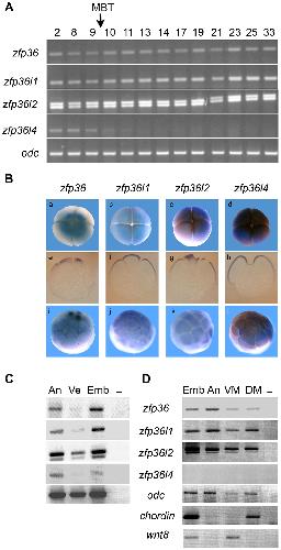Figure 2. mRNA expression of Xenopus zfp36 genes during development. (A) RT-PCR analyses showed that all zfp36 genes are maternally expressed. zfp36, zfp36l1 and zfp36l2 mRNAs are expressed at a constant level throughout development from stage 2 to stage 33 while zfp36l4 mRNA level decreases after the mid-blastula transition (MBT, arrow). (B) In situ hybridization showed that all four zfp36 mRNA are localized at the animal pole in 4-cell stage (a) and morula stage (i) embyos. e correspond to histological sections from embryos shown in a. (C) RT-PCR analysis showed that zfp36 mRNAs are preferentially expressed in the animal pole region of blastula embryos. (D) RT-PCR analysis showed that zfp36 mRNAs are expressed throughout the embryo at the gastrula stage. An, animal pole; DM, dorsal marginal zone; Emb, whole embryo; Ve, vegetal pole; VM, ventral marginal zone. A control embryo (Emb) assayed by RT-PCR for the expression of control genes chordin and wnt8. odc was used as control of loading and a reaction was performed in the absence of reverse transcriptase to check for genomic DNA contamination (-). |