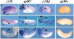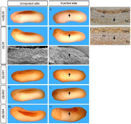 Figure 5. Zfp36 mRNA overexpression induces somites segmentation defects. 250 pg of mouse zfp36 mRNA (a, b) or Xenopus zfp36 (d, e), zfp36l1 (I, j), zfp36l2 (k, l) or zfp36l4 (m, n) mRNA were injected into one blastomere of two-cell stage embryos and developing embryos were fixed at stage 28 before immunhistochemistry analysis with the somite specific marker 12/101. Embryos were embedded in paraffin then sectioned longitudinally (c, f) or treated for scanning electronic microscopy (g, h). The arrows mark the alteration of segmentation on the injected side (Inj) by comparison with the uninjected side (Uninj). no, notochord; so, somite. |