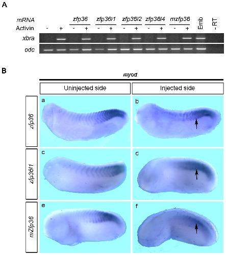 Figure 6. Zfp36 mRNA overexpression does not prevent mesoderm induction nor myogenic factor expression. (A) Two-cell stage embryos were injected with 250 pg of the different Xenopus zfp36 mRNAs or mouse zfp36 mRNA (mzfp36) and animal caps were explanted at stage 8.5 then treated with 10 ng/ml of activin before analysis by RT-PCR for xbra expression when control embryos reached stage 12. Stage 12 embryo (Emb) or untreated animal caps (-) were assayed by RT-PCR in parallel. Odc was used as control of loading and a reaction was performed in the absence of reverse transcriptase to check for genomic DNA contamination (-RT). (B) 250 pg of Xenopus zfp36 (a, b) and zfp36l1 (c, d) or mouse Zfp36 (mZfp36, e, f) mRNAs were injected in one blastomere of two-cell stage embryos and developing embryos were fixed at stage 28 and analyzed by in situ hybridization for myod expression. |