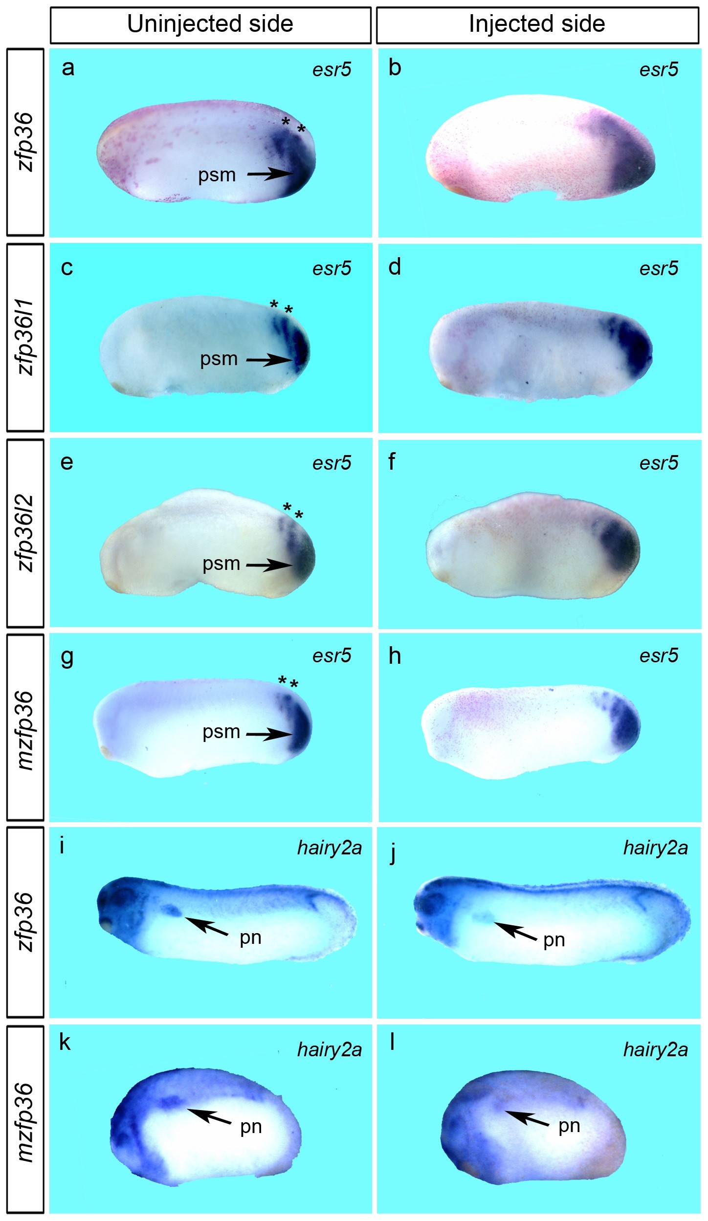 Figure 7. Zfp36 mRNA overexpression alters the expression of notch signalling pathway members esr5 and hairy2a. 250 pg of Xenopus zfp36 (a, b, i, j), zfp36l1 (c, d), zfp36l2 (e, f) or mouse zfp36 (mzfp36, g, h, k, l) mRNAs were injected into one blastomere of two-cell stage embryos and developing embryos were fixed at stage 25 (a and k, l) or stage 28 (i, j) and analyzed by in situ hybridization for esr5 and hairy2a expression. Arrows in a, c, e and g mark the presomitic mesoderm (psm) and the pronephros region (pn) in i respectively. Stars in a, c, e and g mark the first two somitomeres. |