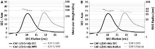 Figure 5. Determination of the apparent molecular weight of CAF-1/H3-H4 complex using SEC-MALS. (A) The elution profiles for CAF-1 (gray) and H3-H4 bound CAF-1 (black). H3-H4 binding by CAF-1 results in earlier elution volumes (10 ml) than CAF-1 alone (12 ml), suggesting a larger molecular weight for the complex. Light scattering confirms a consistently larger molecular weight across the earlier eluting peak (Panel A, right axis and Table 2). (B) The same size exclusion peak profile as (A), but with the measured root mean square (RMS) radius for each peak highlighted on the right axis. The CAF-1/H3-H4 complex has only a slightly larger radius in solution than CAF-1 alone (Table 2).