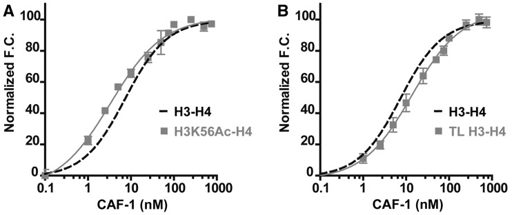 Figure 2. Acetylation of H3K56 increases CAF-1 affinity for H3-H4, whereas removal of the terminal histone tails has no measurable effect. (A) The binding curves for H3K56Ac-H4 (gray squares) and wild-type H3-H4 (dashed line) with increased concentration of CAF-1. CAF-1 binds the acetylated form of H3-H4 with ∼2.5-fold higher affinity than that of the wild-type H3-H4 complex as shown through increased binding (more fluorescence change) at lower CAF-1 concentrations. (B) The effect of the histone tails on CAF-1 binding. H3-H4 complex lacking amino-terminal tails (gray squares) (H3 res. 27-135 and H4 res. 20-102) are titrated with CAF-1 and produce a markedly similar binding curve as the wild-type H3-H4 (dashed line). The error bars represent the standard error within individual data points.The total data points for a single experiment are 48.