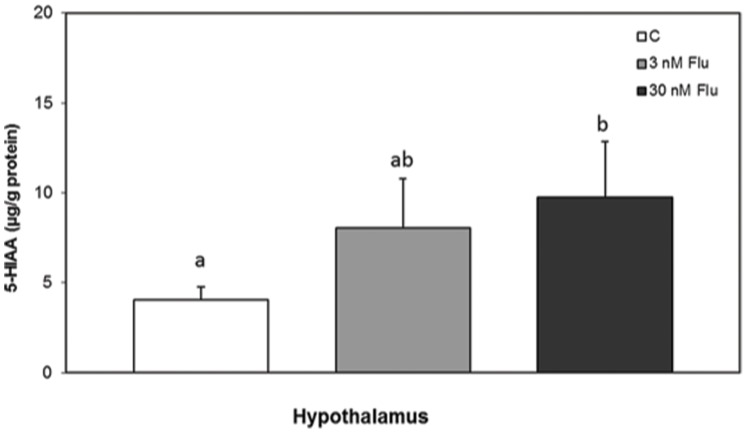 Figure 1. Concentration of 5-HIAA in the hypothalamus of Xenopus tropicalis at metamorphosis after developmental chronic exposure to fluoxetine at two different concentrations, 3 nM FLU (grey bar) and 30 nM FLU (black bar) and in controls (C, white bar).Values represent mean ± SEM. Different superscript letters indicate significant differences between exposure groups (P<0.05, Tukey post hoc). nâ=â12â18.