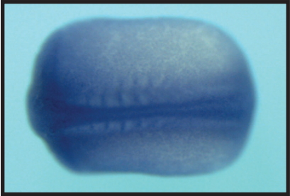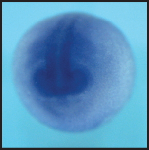 kmt5c (lysine (K)-specific methyltransferase 5C) gene expression in Xenopus laevis embryo, assayed via in situ hybridization, NF stage 17, anterior view, dorsal up. |