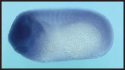 kmt5c (lysine (K)-specific methyltransferase 5C) gene expression in Xenopus laevis embryo, assayed via in situ hybridization, NF stage 33-34, lateral view, anterior left, dorsal up. |