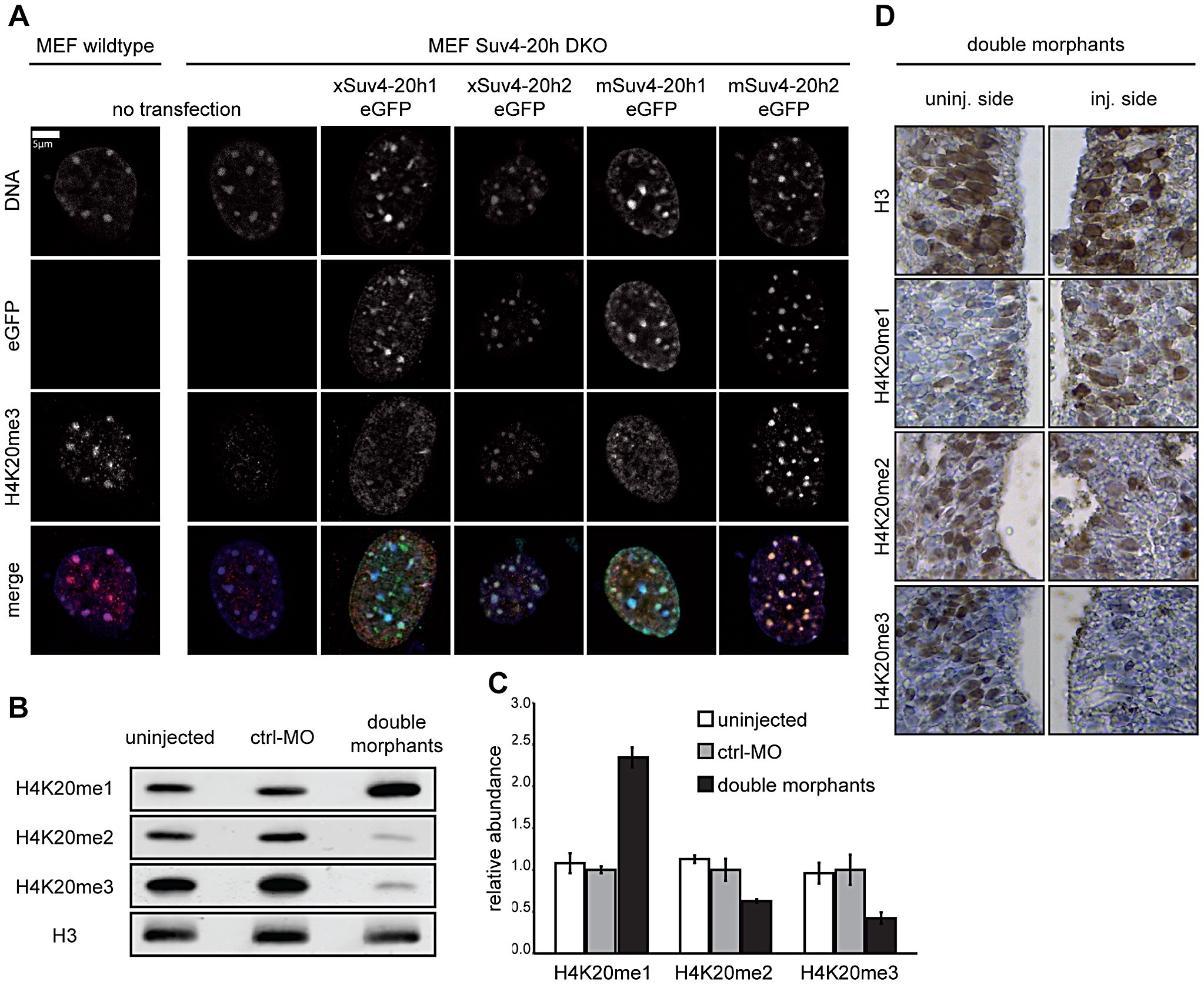 (A) Transiently transfected eGFP-tagged Suv4-20h1 and h2 enzymes from frog or mouse re-establish H4K20me3 marks in heterochromatic foci of Suv4-20h1/h2 DKO MEFs. (B) Bulk histones from tadpoles (NF30-33) injected with morpholinos targeting translation of endogenous xSuv4-20h1 and h2 mRNA show a strong reduction in H4K20me2 and H4K20me3 levels and a concomitant increase in the H4K20me1 mark. (B) Western Blot analysis of uninjected embryos, control morphants (ctrl-MO), and double morphants with antibodies against H4K20 mono-, di- and trimethylation. PanH3 antibody was used as loading control. (C) Western Blot quantification of three independent biological experiments; data represent mean values, error bars indicate SEM. (D) Immuno-histochemistry on xSuv4-20h double morphant tadpoles. Panels show details from neural tubes stained with antibodies against the histone epitopes indicated on the side. Whole sections shown in Figure S5A.