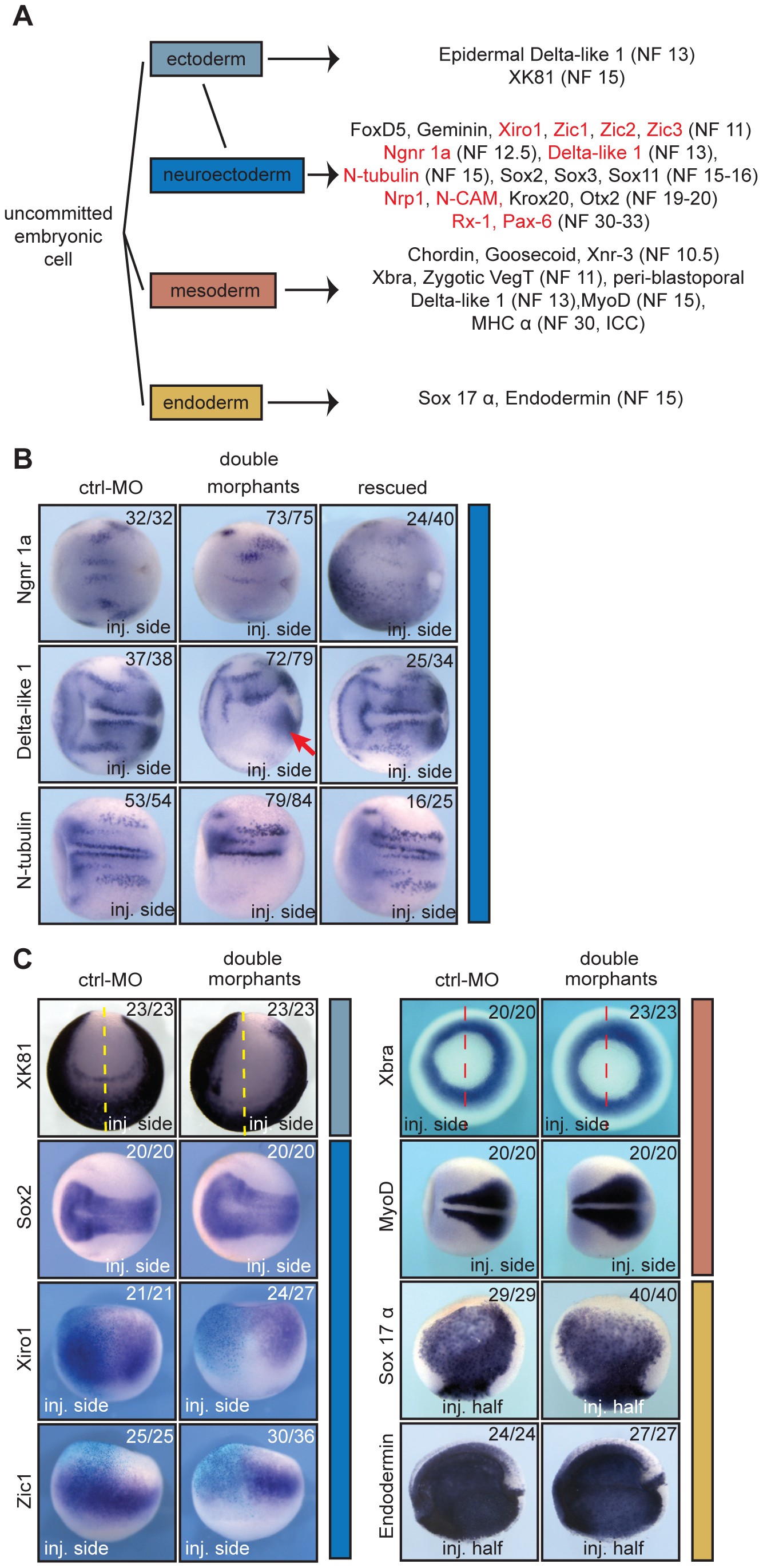 (A) Schematic illustration of analysed markers of the different germ layers (germ layer colour code extended to in situ panels). Downregulated genes upon xSuv4-20h depletion are labelled in red. (B) Expression pattern of the neuroectodermal markers Ngnr 1a (NF12.5), Delta-like 1 (NF13), and N-tubulin (NF15). The pictures show dorsal views of the open neural plate with anterior to the left. (C) Expression patterns of XK81 (ectoderm), Sox2, Xiro1, Zic1 (neuroectoderm), Xbra, MyoD (mesoderm), Sox17 α, Endodermin (endoderm) in ctrl-MO injected or double morphant embryos. XK81 - anterior views with dorsal side to the top. Sox2 and MyoD - dorsal views, anterior to the left. Xiro1 and Zic1 - dorsal views; injected halves are lineage-traced by coinjection of LacZ mRNA and subsequent βal staining (light blue). Xbra - vegetal view. Sox-17 α - internal stain from the injected side in bisected embryos, animal pole up. Endodermin internal stain from the injected side in bisected embryos; anterior to the left.