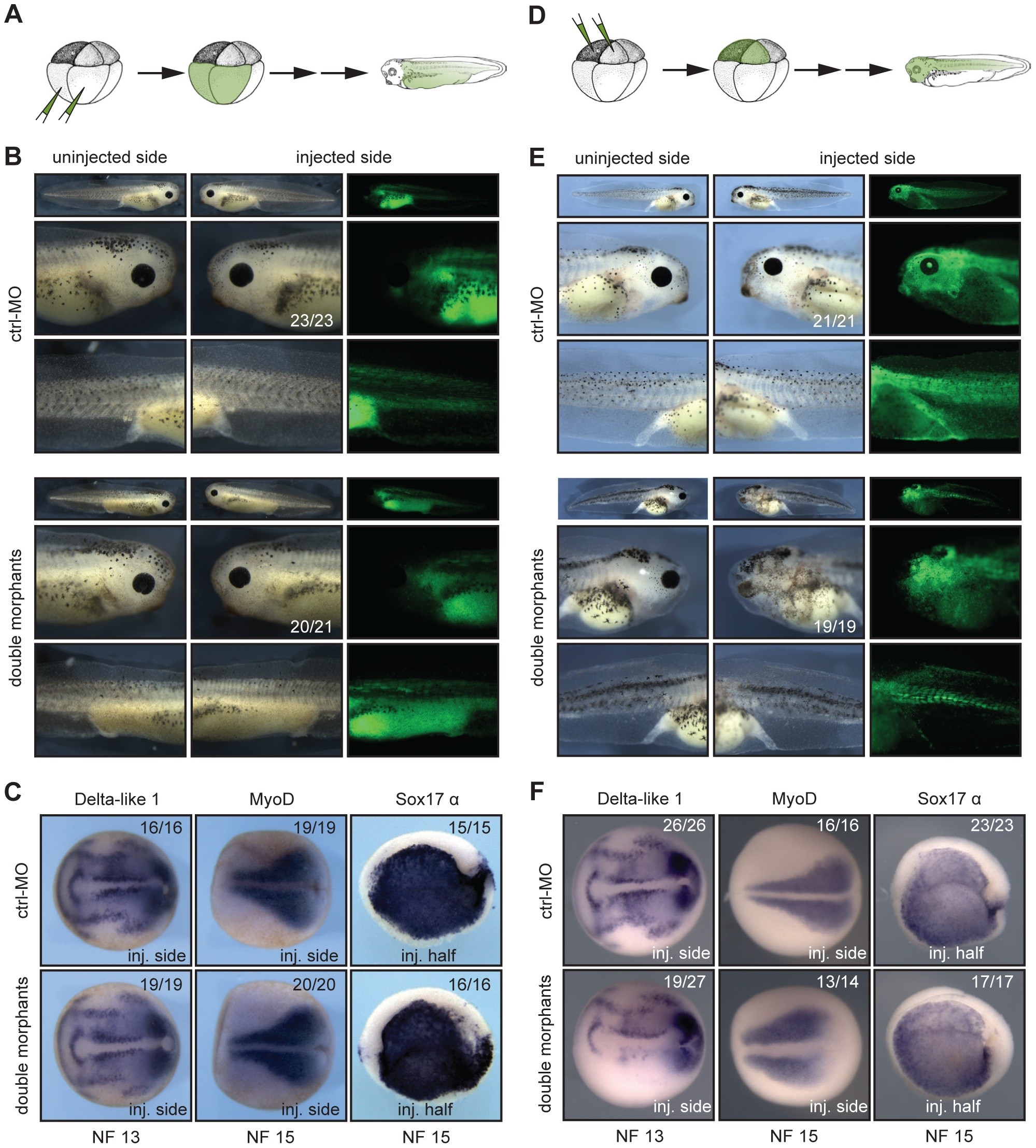 (A, D) Schematic illustrations of targeting microinjections into mesendodermal or ectodermal territories at 8-cell stage. (B) Injecting xSuv4-20h MOs into the mesendoderm causes no apparent morphological phenotype in the embryo. (C) Neural, mesodermal and endodermal marker genes are expressed normally. (E) xSuv4-20h MOs reduce eyes, cranial and trunk melanophores, when injected into the ectoderm. (F) Expression of all tested markers in mesoderm and endoderm is normal, except for Delta-like 1, whose expression specifically in the open neural plate is strongly reduced on the injected side. Global morphology was assessed at hatching stage (NF36), molecular markers at indicated stages during neurulation. Top row images in (B) and (E) depict whole embryos for overview.
