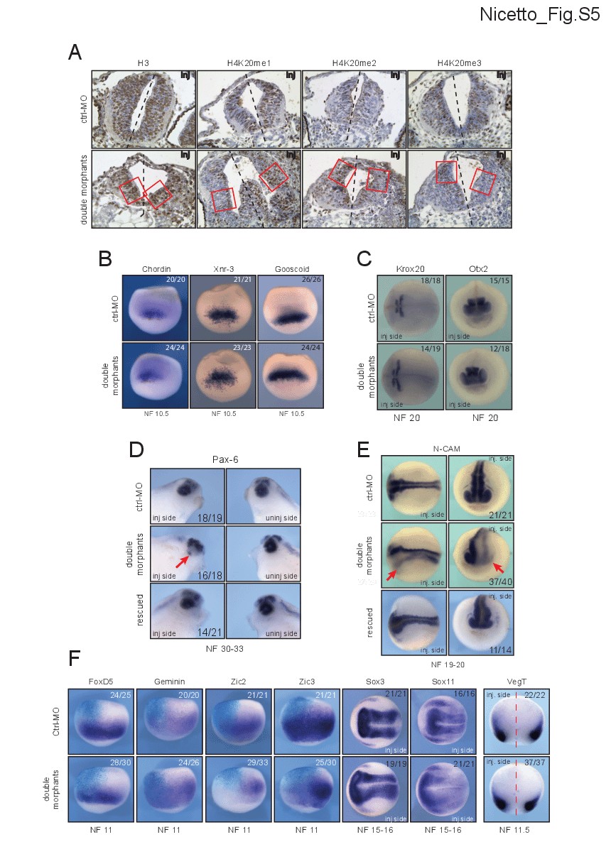 Figure S5. Germ layer marker gene expression in xSuv4-20h double morphants. (A) Immuno-histochemistry on ctrl-MO and xSuv4-20h double-morphant tadpoles. Panels show representative cross-sections of neural tubes stained with antibodies against the histone epitopes indicated on top. Inj injected side. Squares on double-morphant sections represent the croped pictures shown in Figure 1D. (B-F) RNA in situ hybridization analysis of ctrl-MO injected and double morphant embryos at the indicated stages using probes against Chordin, Xnr-3 and Gooscoid (B), Krox20 and Otx2 (C), Pax-6 (D), N-CAM (E), FoxD5, Geminin, Zic2, Zic3, Sox3, Sox11 and VegT (F). Chordin, Xnr-3 and Gooscoid dorsal side views; animal pole is on the top. Krox20 - dorsal views, anterior on the left. Otx2 - anterior views, dorsal on the top. Pax-6 head region; rescued embryos included. N-CAM - dorsal views of stained embryos with the anterior on the left; rescued embryos included. FoxD5, Geminin, Zic2, Zic3 - dorsal views; injected halves are lineage-traced by coinjection of LacZ mRNA and subsequent βal staining (light blue). Sox2, Sox3 - dorsal views, anterior to the left. VegT - internal stain in bisected embryos. |
