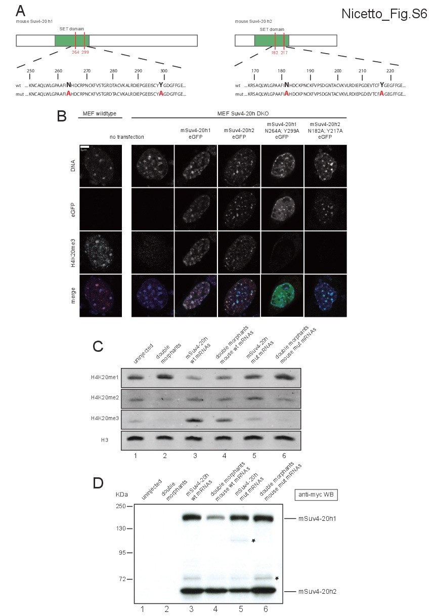Figure S6. Functional SET domains are required for proper Suv4-20h activity. (A) Schematic of Mus musculus Suv4-20h1 and h2 SET domain mutations. (B) Immunofluorescence of wild-type and Suv4-20h DKO MEFs transfected with the indicated constructs. (C) Western Blot analysis of NF11.5 uninjected embryos (lane 1), xSuv4-20h1, h2 double morphants (lane 2), active and inactive mouse Suv4-20h1, h2 mRNAs injected embryos (lane 3, 5 respectively) and double morphant embryos cojnected with active or inactive mSuv4-20h1, h2 mRNAs (lane 2, 4 respectively), using antibodies against H4K20 mono-, di- and trimethylation. PanH3 antibody was used as loading control. (D) Anti-myc western blot with the same samples used in B. Asterisks indicate unspecific bands. |