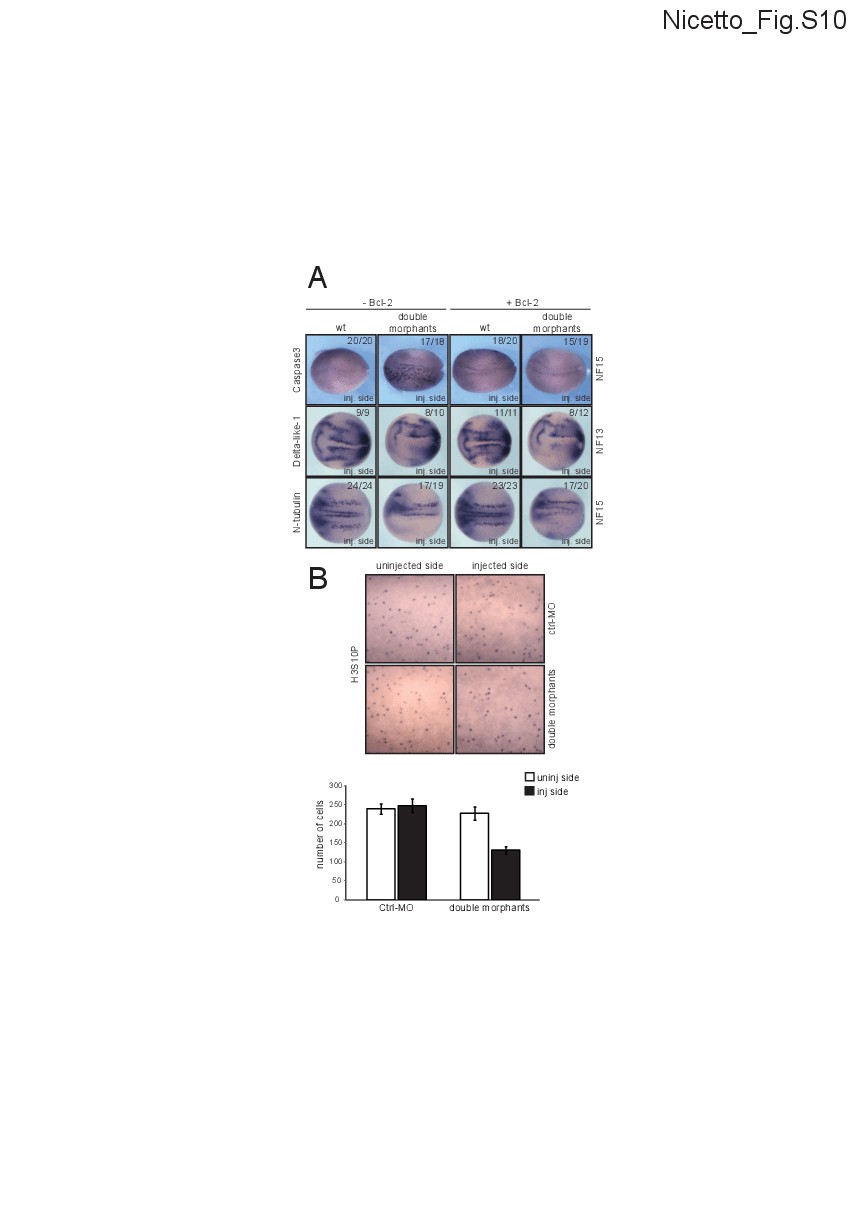 Figure S10. Cell proliferation and apoptosis in xSuv4-20h double morphants. (A) Double morphants show increased number of apoptotic cells during neurulation. Top row immunocytochemistry for active Caspase3 in unilaterally injected embryos (NF15). Middle and bottom rows - RNA in situ hybridisation for Delta-like 1 (NF13) and N-tubulin mRNAs (NF15). Pictures show dorsal views, with anterior to the left. (B) Proliferation assay immunocytochemistry for the mitotic histone modification H3S10P in Crtl-MO versus double morphant embryos. The chart shows a two-fold difference in the number of H3S10P positive cells on the injected side of double morphants. Data represent mean values of four embryos per condition from two independent experiments; error bars indicate SEM. |