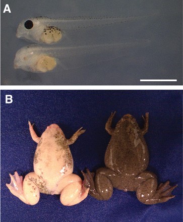 (A) Tadpole injected with 600â pg of RNA encoding Left TALEN (upper) and albino tadpole injected with 300â pg of RNA encoding each of the TALEN pair targeting the tyr gene (lower). Scale bar: 1â mm. (B) Control, wild type (right) and albino frog (left), generated by injecting TALEN mRNAs targeting the tyr gene.