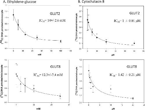 Inhibition of GLUT2- and GLUT8-mediated DHA transport by exo- and endofacial sugar transporter inhibitors. Oocytes injected with GLUT2 (â) and GLUT8 (â´) were incubated with 300 μM [14C]DHA for 10 min in the presence of 0�100 mM of the exofacial sugar transporter inhibitor, ethyldiene glucose (A) and 0�50 μM of the endofacial sugar transporter inhibitor, cytochalasin B (B). Oocytes were washed, and internalized radioactivity was quantified. A best fit curve for the collected data were obtained using the nonlinear regression analysis equation, y = min + (max â min)/1 + (x/IC50) â Hill slope four-parameter logistic curve (SigmaPlot). Data represent mean � S.D. of 10�20 oocytes.