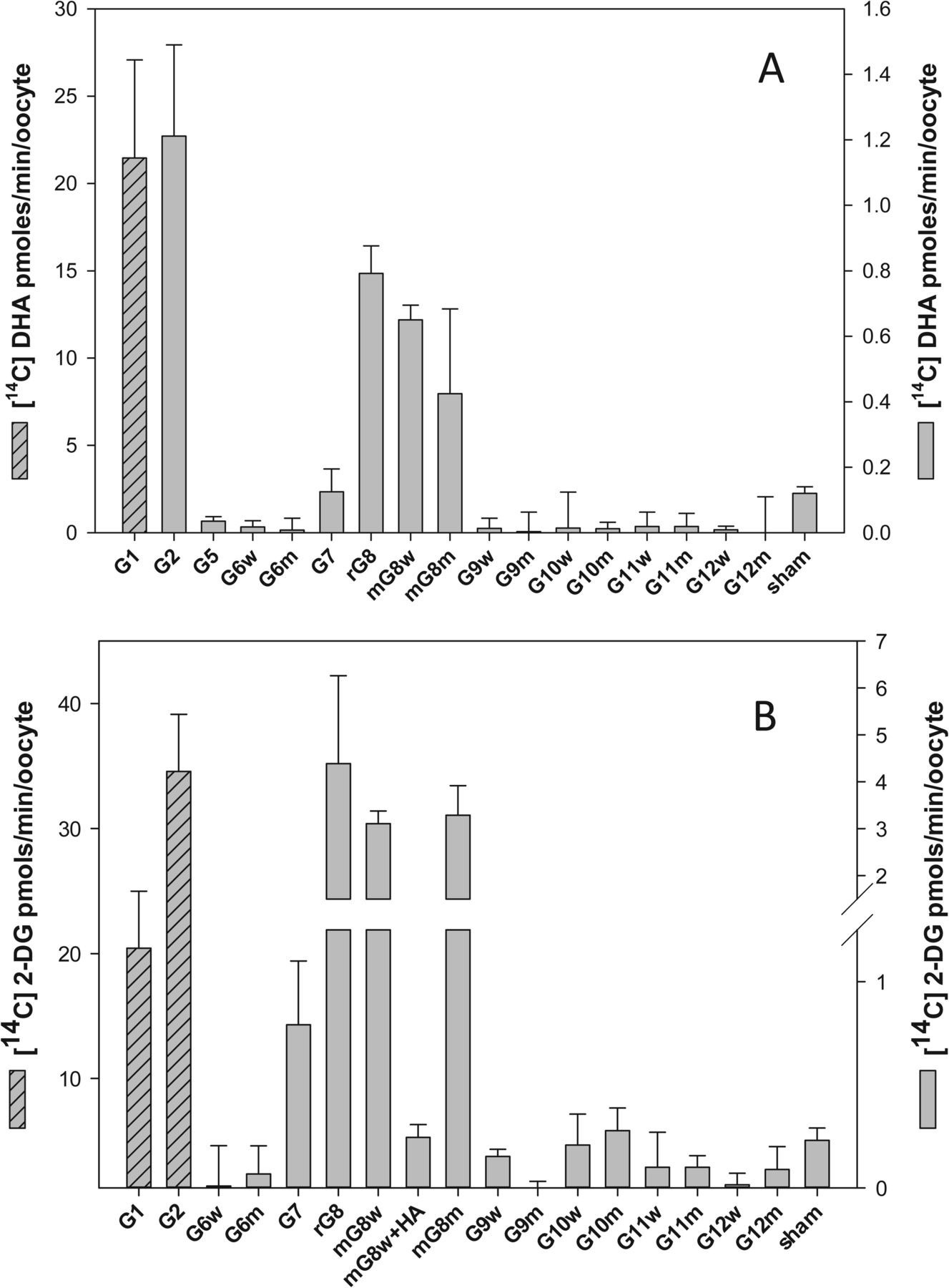 DHA and 2-DG uptake in oocytes injected to express sugar transporters. Xenopus oocytes previously injected with GLUT1, -2, and -5�12 were incubated for 10 min at room temperature with 300 μM [14C]DHA (A) or 1 mM 2-[3H]DG (B). Oocytes were then washed, and intracellular radioactivity was quantified. Control was sham water-injected oocytes. G, facilitative sugar transporter; m, mouse; r, rat; w, wild type GLUT (di-leucine motif); m, mutant GLUT (di-alanine motif); HA, human influenza hemagglutinin. Results are mean � S.D. of 10�20 oocytes.