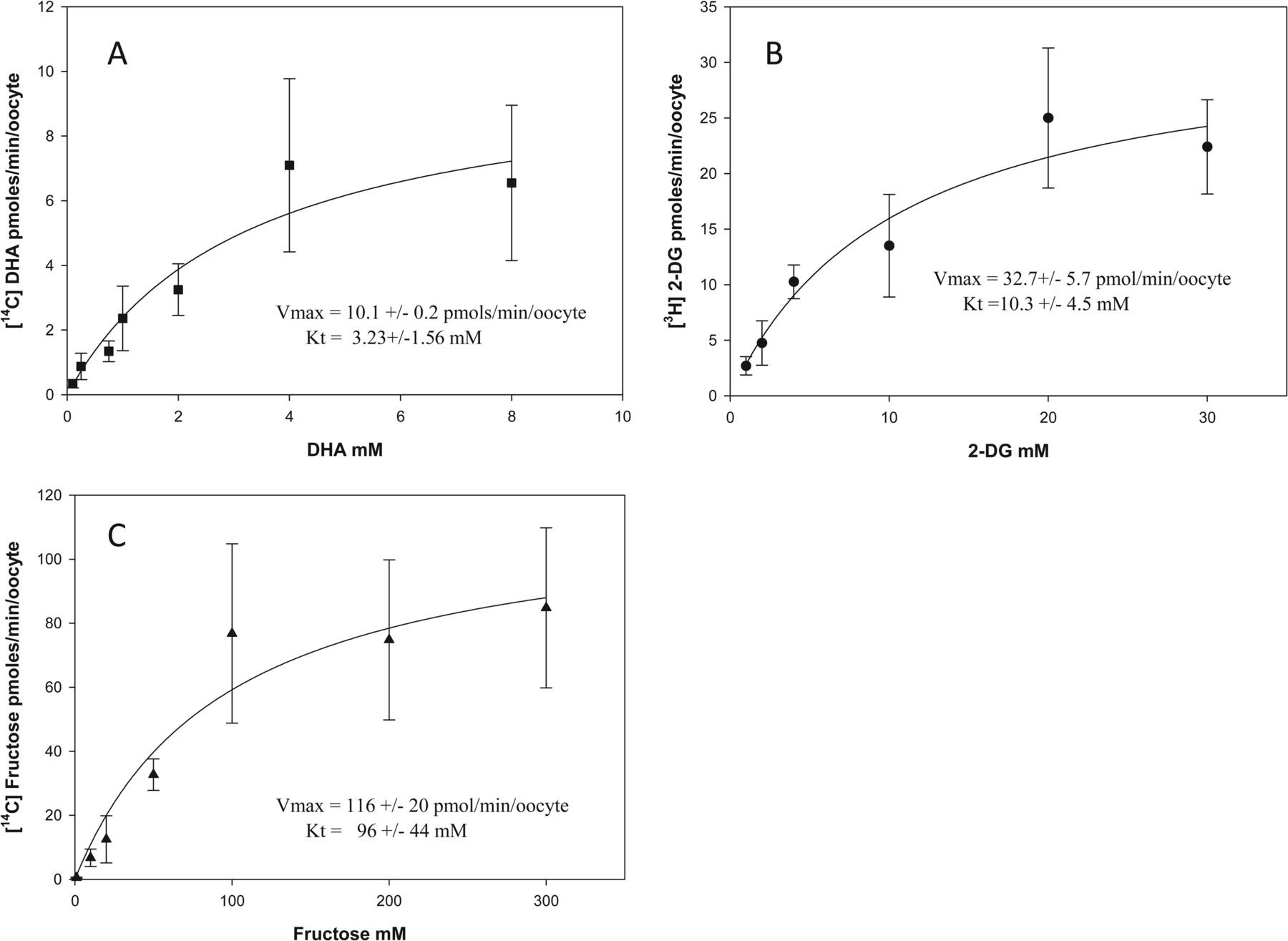 DHA, 2-deoxy-D-glucose, and D-fructose transport kinetics in GLUT2-injected oocytes. Oocytes previously injected with GLUT2 mRNA were incubated for 10 min with 0�8 mM [14C]DHA (A), 0�100 mM 2-[3H]DG (B), and 0�300 mM D-[14C]fructose (C). Oocytes were then washed and intracellular radioactivity quantified. A best fit curve was fitted to the collected data using the nonlinear regression function Y = Vmax�X/Kt + X (SigmaPlot). Data represent mean � S.D. of 10�20 oocytes.