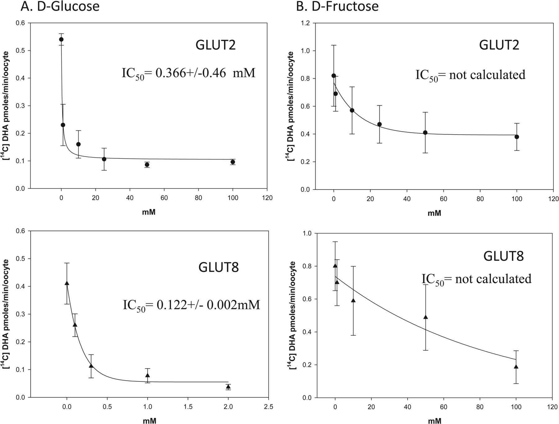 Inhibition of GLUT2- and GLUT8-mediated DHA uptake by sugars. Oocytes injected with GLUT2 (â) and GLUT8 (â´) were incubated with 300 μM [14C]DHA for 10 min in the presence of 0�100 mM D-glucose (A) and 0�100 mM D-fructose (B). Oocytes were washed, and internalized radioactivity was quantified. A best fit curve for the collected data was obtained using nonlinear regression analysis. Data represent mean � S.D. of 10�20 oocytes.
