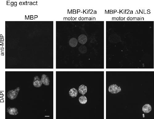 Figure 4—figure supplement 1. Kif2a is regulated by importin immunofluorescence detection of recombinant MBP or MBP fused to the motor domain of kif2a added at 250 nM to interphase egg extracts, showing kif2a nuclear import that is lost upon mutation of the NLS.DOI: http://dx.doi.org/10.7554/eLife.00290.012 |