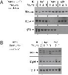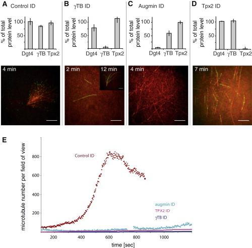 igure 4. Molecular Factors Required for Branching Microtubule Nucleation in the Presence of RanQ69L and TPX2(A) A control immunodepletion of the extract with total IgG fraction antibodies still produced fan-shaped structures composed of branching microtubules and did not significantly affect levels of augmin (Dgt4 subunit), γ-TB, and TPX2 levels as quantified in a western blot (bottom). Error bars represent the SD of three independent experiments with different extracts).(B) Immunodepletion of γ-TB (bottom) almost extinguished microtubule nucleation; most fields had no or only a few microtubules; after longer times (7 min), rare examples of fan-shaped structures with few, but long, microtubules could be found on the coverslip (see inset).(C) Immunodepletion of the augmin Dgt4 subunit, which depletes the entire augmin complex and one third of γ-TB (bottom), abolished branching microtubule nucleation but still allowed for microtubule growth.(D) Similarly, immunodepletion of TPX2 abolished branching microtubule nucleation but still allowed for microtubule growth.(E) Quantification of microtubule number over time for different immunodepletions. Reactions were made in the presence of RanQ69L plus TPX2 (except for the TPX2 depletion, in which case only RanQ69L was added). See Figure S2 and Movie S6.Scale bars, (AâD) 10 μm. The time shown indicates the approximate time of recording after adding the extracts to the flow cell. See Movie S6 for sequences of these immunodepletions. See also Figure S2. |