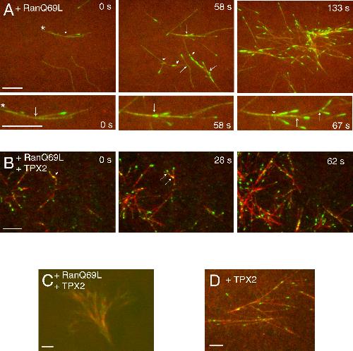 Figure 2. Quantifying the Effect of RanQ69L and TPX2 on Microtubule NucleationThe number of GFP-EB1 spots is counted for each time frame and experimental condition and plotted against time. Because each microtubule, even when branched, is marked by a single EB1 spot at its growing plus tip, counting the number of EB1 spots directly corresponds to the number of microtubules per frame and field of view (82.2 à 82.2 μm). Data are from a control extract in which only vanadate was added or experiments in which further additions of RanQ69L, TPX2, or RanQ69L plus TPX2 were made. |