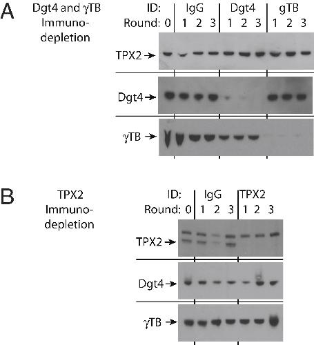 Figure S2. Immunodepletions of TPX2, Augmin and γ-TB from Xenopus Egg Extract, Related to Figure 4(A) Immunoblot of immunodepletion of total IgG-fraction antibodies as a control and TPX2.(B) Immunoblot of immunodepletion of augmin, γ-TB, and total IgG-fraction antibodies. |