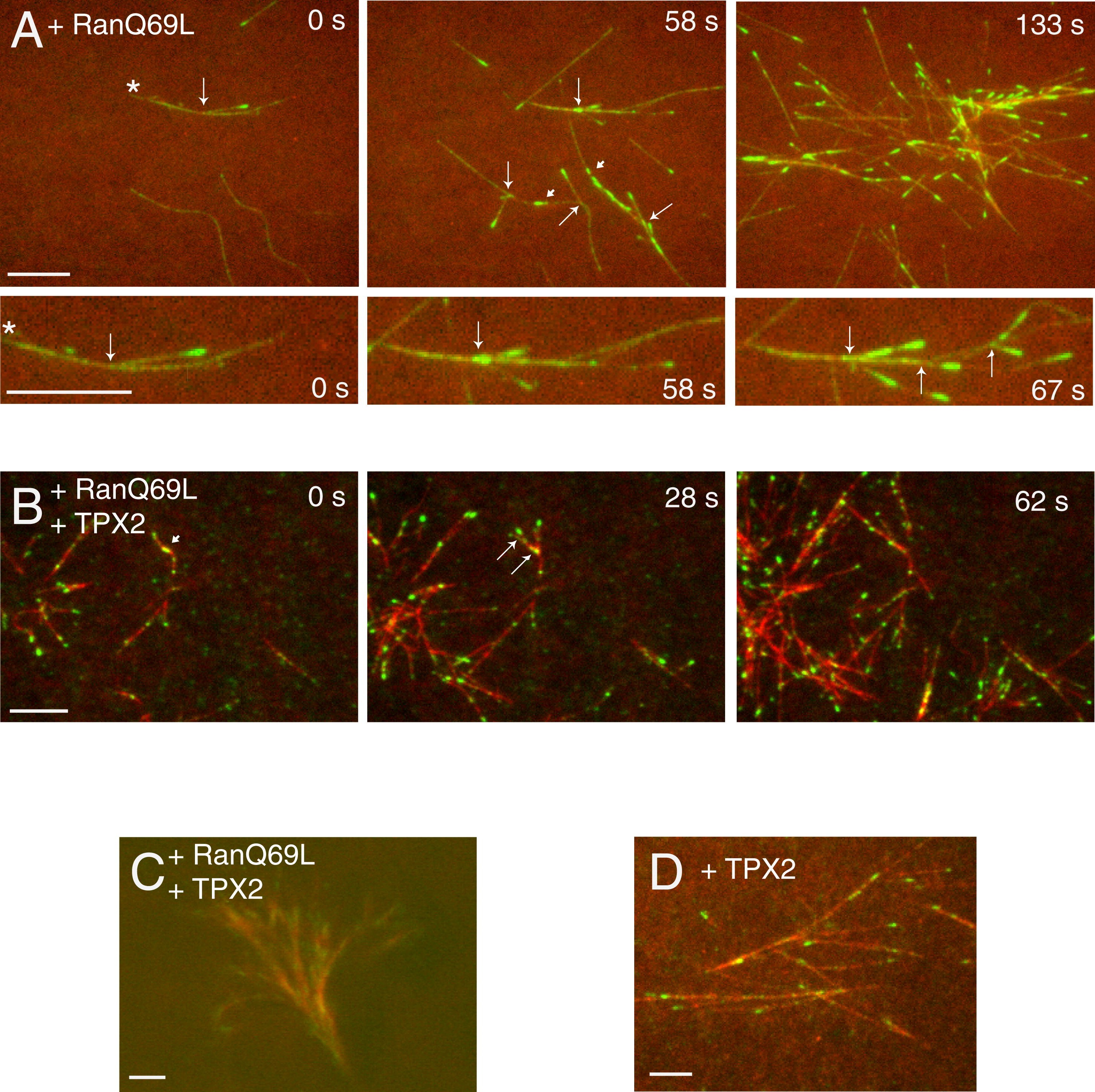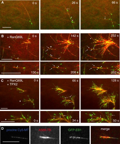 Figure 1. Branching Microtubule Nucleation Is Stimulated by Ran and TPX2 in Meiotic Xenopus Egg Extracts(A) Branching microtubule nucleation in Xenopus egg meiotic extracts without added Ran or TPX2. EB1-GFP (green) was added to the extract to follow the microtubule plus ends and thus identify locations of new microtubule growth. Alexa568-labeled bovine brain tubulin (red) was added to visualize microtubules. Sodium orthovanadate was added to prevent dynein-mediated sliding of microtubules along the glass and allow better observation of branching microtubules. Long arrows indicate nucleated microtubules that emerge as a clear angled branch from the mother microtubule. Short arrows indicate nucleated microtubules that grow along the length of the mother microtubule. The time of this sequence is shown in seconds. Scale bar, 5 μm. See also Movie S1.(B) Branching nucleation is stimulated in the presence of a constitutively active Ran mutant (RanQ69L). Arrows are as in the Figure 1A legend. Asterisks indicate regions that are enlarged in the lower panels. Scale bar, 5 μm. See also Movie S2.(C) Microtubule nucleation in an extract containing both RanQ69L and TPX2, leading to branched fan-like structures in the absence of microtubule gliding. Arrows are as in the Figure 1A legend. Asterisks indicate regions that are enlarged in the lower panels. Scale bar, 5 μm. See also Movie S3.(D) Branching occurs from an exogenously added template microtubule. GMPCPP-stabilized, Cy5-labeled pig brain microtubules were attached to a passivated glass coverslip (to prevent binding of endogenous microtubules), and a reaction mixture of Xenopus extract, RanQ69L, TPX2, EB1-GFP and Alexa568-labeled bovine brain tubulin was added. New microtubule growth (EB1-GFP spots) can be seen emerging from the template microtubule. Scale bar, 10 μm.See also Figure S1, and Movies S4 and S5. |