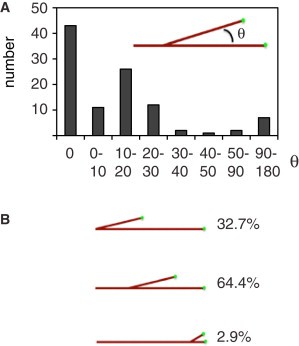 Figure 3. Properties of Branching Microtubule Nucleation in a RanQ69L-Treated Extract(A) Quantification of branch angles between the mother microtubule and the newly growing daughter microtubule. A 0° angle corresponds to growth of a new microtubule parallel to the mother microtubule, whereas a 180° angle signifies antiparallel growth. The polarity of the mother microtubule is preserved if the branch angle is smaller than 90°. Eighty-nine percent of the branches are <30°.(B) Quantification of branch position along the template microtubule. The majority of branches occur along the middle of the microtubule, about a third originate at the microtubule minus end, and more rarely, the EB1-enriched microtubule plus tip branches. |