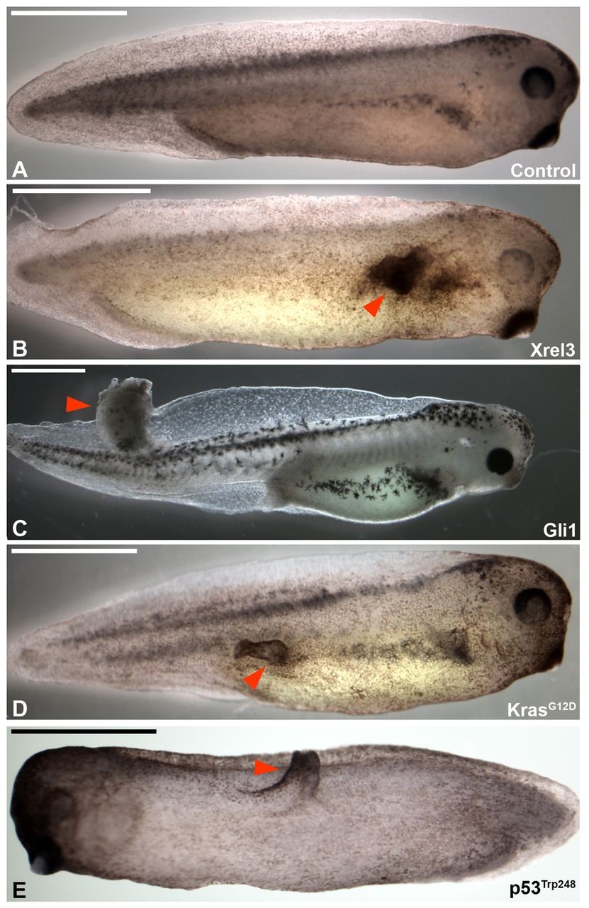 Fig. 1. Overexpression of canonical oncogenes or a mutant tumor suppressor results in the formation of ITLSs in Xenopus laevis embryos. (A) Unperturbed embryo showing normal development at stage 34. (B) Embryos showing the presence of ITLS (red arrowheads). To generate ITLSs, 16-cell stage embryos were injected with 0.5 ng of Xrel3, Gli1, KrasG12D or p53Trp248 mRNA into a single blastomere. Injected embryos were raised to tail-bud stages (â¼280), scored for the presence of ITLSs and imaged using brightfield microscopy. Scale bars: 1 mm. |