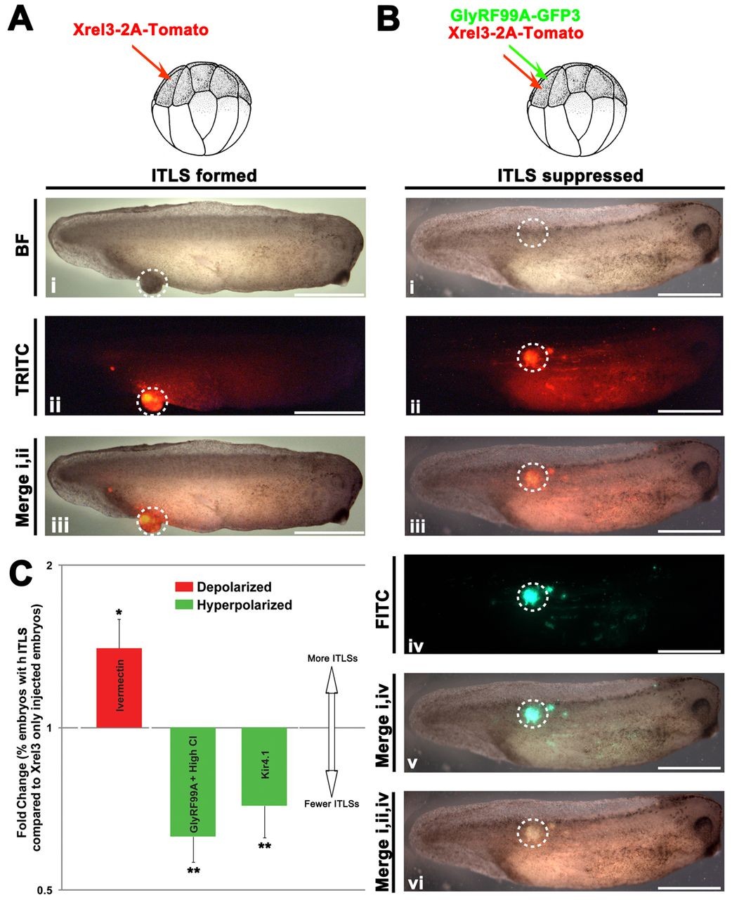Fig. 5. Hyperpolarization suppresses the formation of Xrel3 ITLSs. (A) To visualize and track ITLSs, mRNA encoding a fusion construct of Xrel3 and tdTomato was injected into a single blastomere of 16-cell stage embryos. (Ai,Aii) ITLSs resulting from Xrel3-2A-tdTomato injections were highly fluorescent when visualized under a TRITC filter set. (Aiii) Overlay of brightfield (BF) and TRITC images shows colocalization of ITLS and red fluorescent signal, confirming that foci of oncogene expression are the cells that form ITLS. (B) To test whether hyperpolarization (driving depolarized Vmem back to the normal state) suppresses ITLS formation, a constitutively open, glycine gate chloride channel (GlyRF99A-GFP3) was co-injected with Xrel3-2A-tdTomato into a single blastomere of a 16-cell stage embryo. (Bi) Morphologically apparent ITLSs were often missing from these embryos. (Bii,Biii) Nevertheless, there was expression of Xrel3 protein evidenced by the presence of tdTomato signal. (Biv,Bv) Expression of hyperpolarizing channel protein (GlyRF99A-GFP3) was driven in the same region (Bvi) as Xrel3-2A-tdTomato expressing cells. (C) Fold change in ITLS for embryos co-injected with Xrel3 plus channel mRNA compared with Xrel3-only injected embryos. Xrel3-only injected embryos with ITLS have a ratio of one; ratio values below and above one represent fewer and more embryos with ITLS, respectively. Two very different hyperpolarizing channels (based on Cl− and K+) both resulted in suppression of ITLSs, demonstrating that this effect is due to change in Vmem and not tied to one channel protein or one ion. Fold decreases of 1.54 and 1.62 in the number of embryos were observed for Kir4.1- (K+ hyperpolarizing channel) and GlyRF99A-injected embryos, respectively (one sample t-test, **P<0.01 compared with a normalized value of 1 that represents ITLS incidence in Xrel3-only injected embryos). The number of embryos with ITLS was also increased (1.4-fold) by further depolarizing Xrel3-only injected embryos via ivermectin (one sample t-test, *P=0.05 compared with Xrel3-only injected embryos). Scale bars: 1 mm |