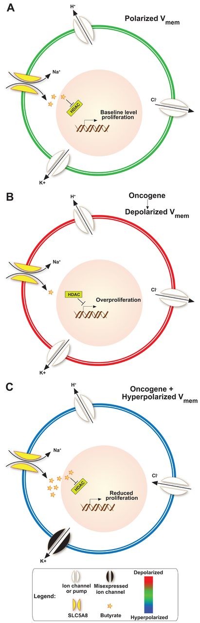 Fig. 7. Model for Vmem-mediated control of cell dynamics during normal development and neoplastic transformation. (A) In unperturbed embryos, polarized Vmem is generated and maintained by several ion channels and pumps present in the plasma membrane; this condition allows moderate amounts of butyrate to influx through SLC5A8 and inhibits HDACs. This epigenetically regulates transcription machinery, thereby maintaining baseline level proliferation and differentiation compatible with normal somatic morphostasis. (B) Expression of oncogenes, or other physiological events [e.g. non-genetically induced depolarization (Morokuma et al., 2008; Blackiston et al., 2011)], results in the inability of SLC5A8 to import butyrate. Higher HDAC activity then leads to overproliferation and other neoplastic changes leading to appearance of tumor-like structures. (C) The effect can be blocked by forced hyperpolarization via molecular and/or pharmacological targeting of H+, K+ or Cl− ion translocators. Forced hyperpolarization of the overall transmembrane potential efficiently powers the uptake of Na+ through SLC5A8. This energetically favorable intake of Na+ drives the inward flux of butyrate through SLC5A8. High levels of butyrate continually block HDAC, which leads to hyperacetylation of important genes, resulting in cell cycle arrest and suppression of ITLS formation. |