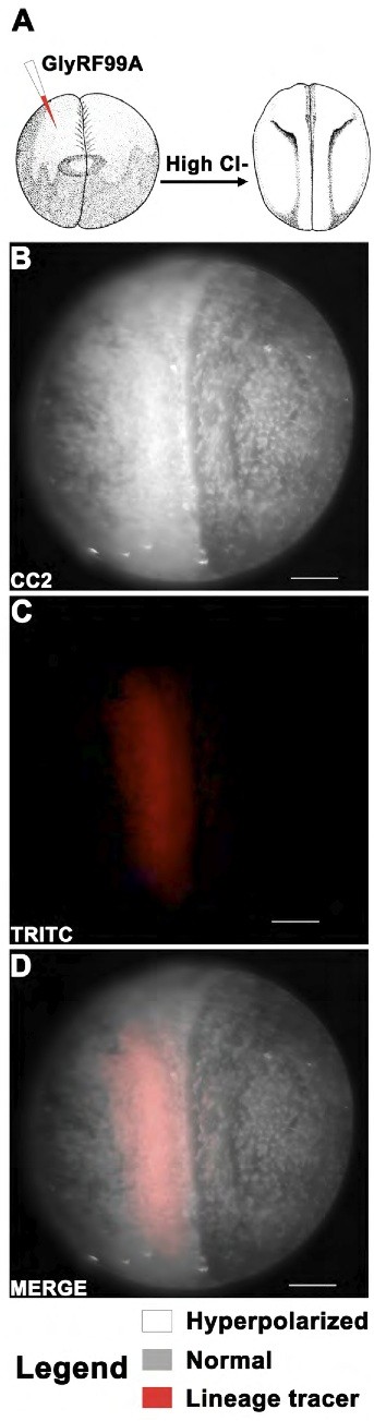 Fig. S2. Hyperpolarization is detected by the voltage sensitive dye CC2-DMPE. (A) Schematic of forcing hyperpolarization by a constitutively open Cl- channel: embryos were co-injected with GlyRF99A mRNA and dextran-conjugated Alexa Fluor 555 (lineage dye) into 1 cell of a 2-cell embryo, allowing the uninjected side to serve as an internal control. Embryos were raised to stage 18 in a high (70 mM) Cl- medium. (B) At stage 18, embryos were soaked in 5 μM CC2 dye in 0.1x MMR, and imaged using a CC2 filter set (EX 405/20; BS 425; EM 460/50). The injected left half of the embryo was highly fluorescent, indicating relative hyperpolarization compared to the right half of the embryo. (C) Imaging of the same embryo using a TRITC filter set confirmed the presence of injected mRNA mix, evidenced by the red fluorescent signal of the lineage tracer. (D) Overlay of CC2 and TRITC images showing the co-localization of hyperpolarization signal and hyperpolarizing channel mRNA. |