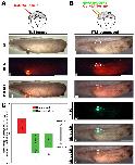Fig. 3. ITLSs exhibit depolarized Vmem. (A) Brightfield image of a Gli1-induced ITLS (outlined in yellow dashes) on the tail of a stage 40 embryo. (B) Depolarization of ITLSs regions was observed when the same embryo was imaged in DiBAC4(3), a fluorescent reporter of Vmem, using the FITC filter set of a fluorescent microscope. (C) Overlay of brightfield and DiBAC4(3) images showing a depolarized Vmem signature exclusive to the ITLS region. Scale bars: 1 mm. |